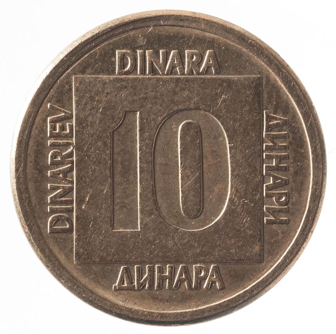 U sredini četverokuta broj 10 (nominala), oko njega tekst DINAR na četiri jezika.