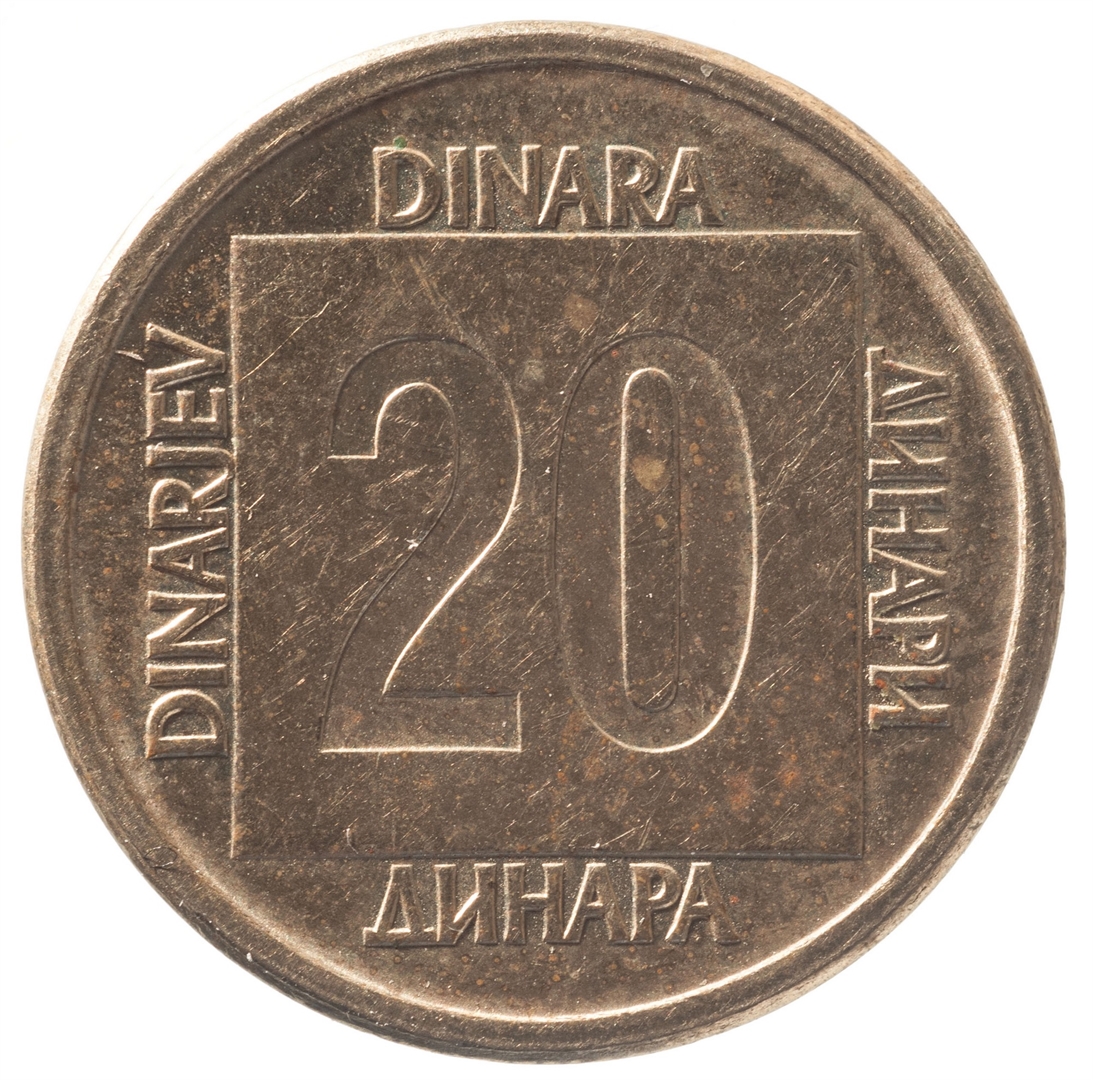Avers: U sredini unutar četverokuta državni grb, a oko njega uz rub polukružno napisan tekst SFR JUGOSLAVIJA na latinici i ćirilici. Ispod godina 1988. Revers: U sredini četverokuta broj 20 (nominala), oko njega tekst DINAR na četiri jezika.