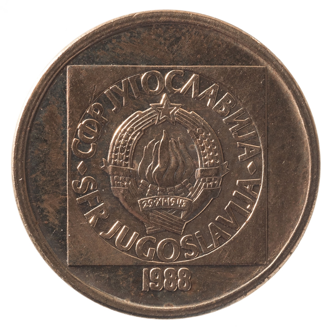 U sredini unutar četverokuta državni grb, a oko njega uz rub polukružno napisan tekst SFR JUGOSLAVIJA na latinici i ćirilici. Ispod godina 1988.