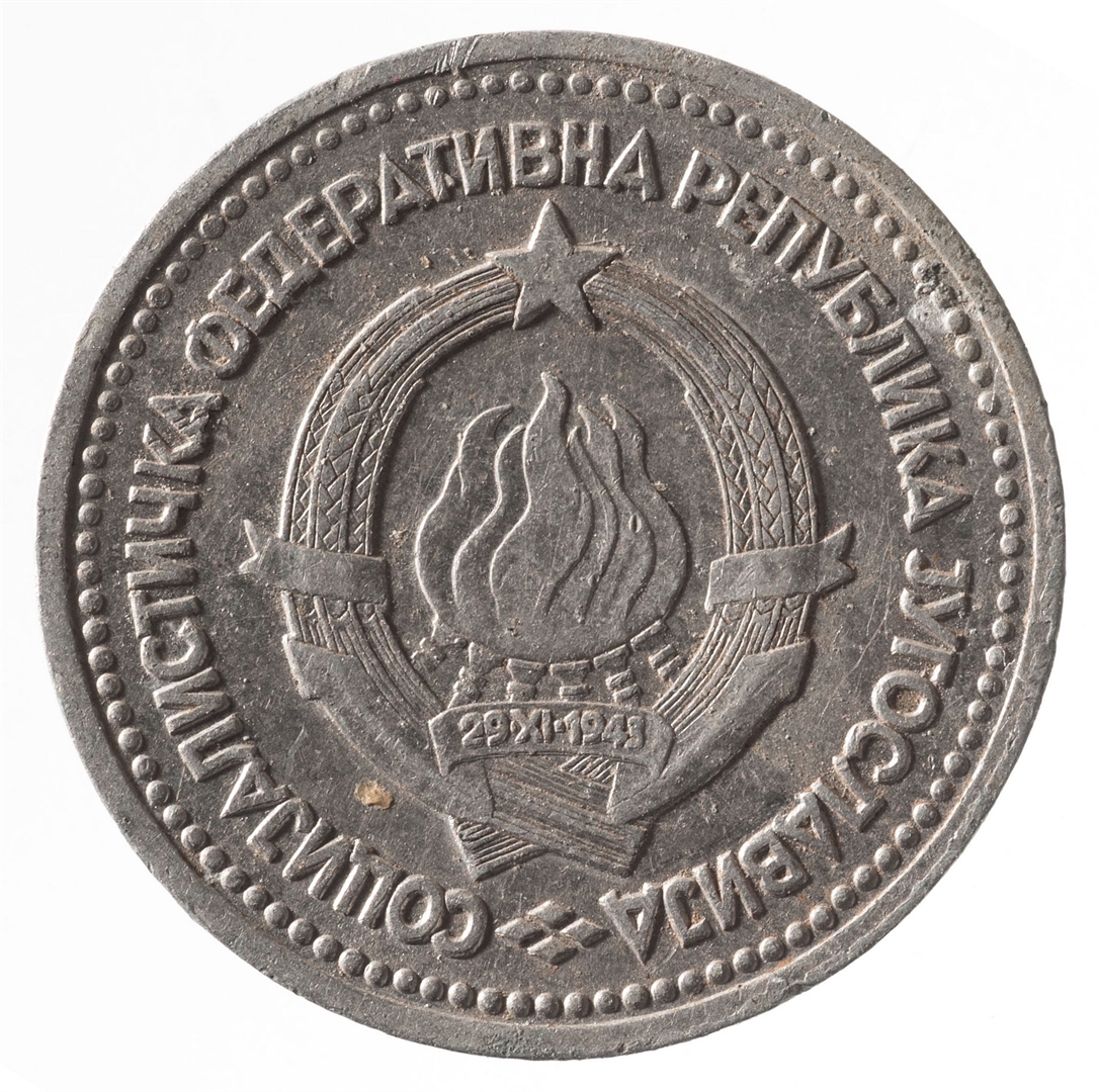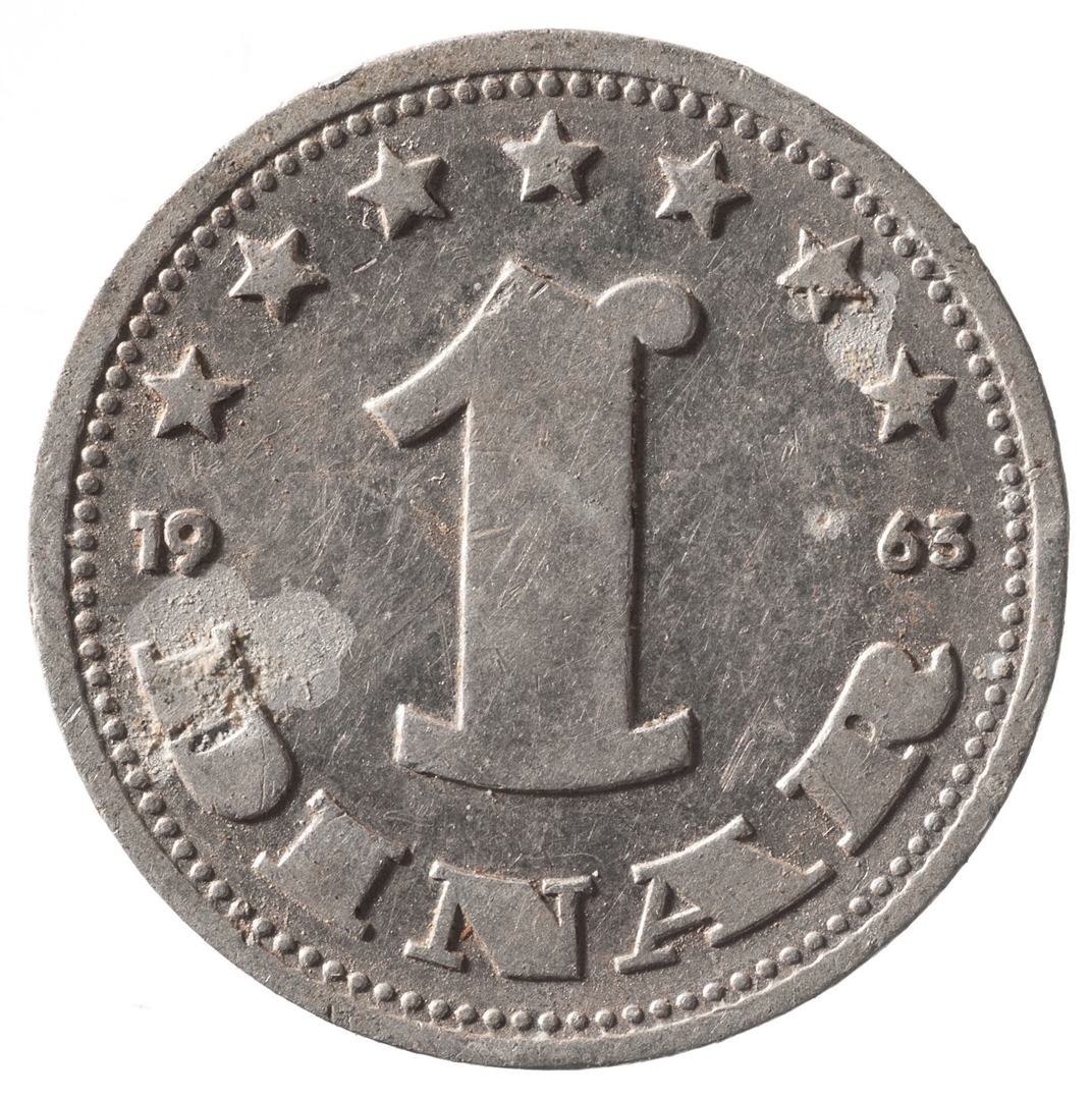 U sredini broj 1 (nominala), a ispod njega tekst DINARA. Duž cijelog gornjeg ruba polukružno poredano 7 petokrakih zvjezdi. U sredini uz lijevi i desni rub upisana godina 1963.