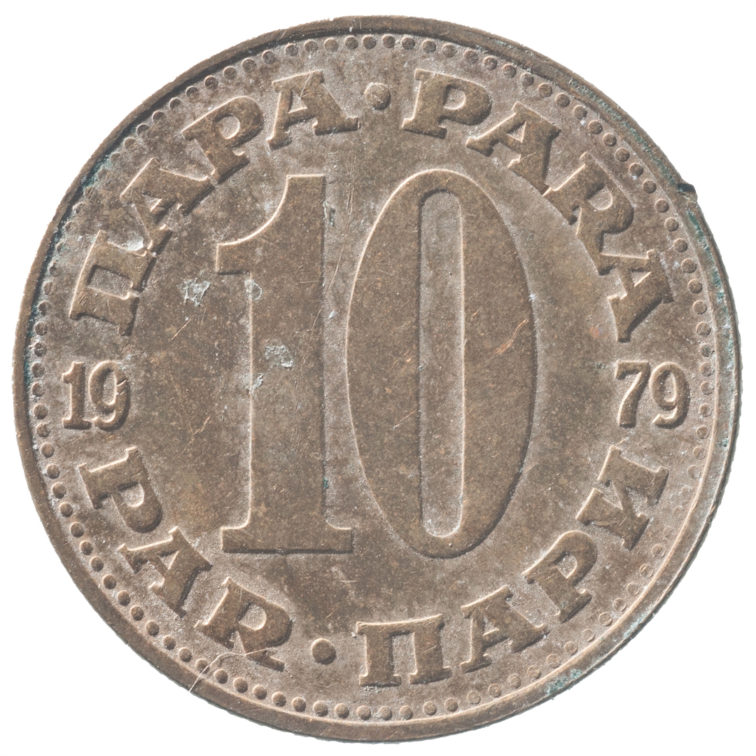Avers: U sredini državni grb. U gornjem djelu uz rub polukružno napisan tekst SFR JUGOSLAVIJA na latinici i ćirilici. Revers: U sredini broj 10 (nominala), a oko njega tekst PARA na četiri jezika. U sredini uz lijevi i desni rub upisana godina 1979.