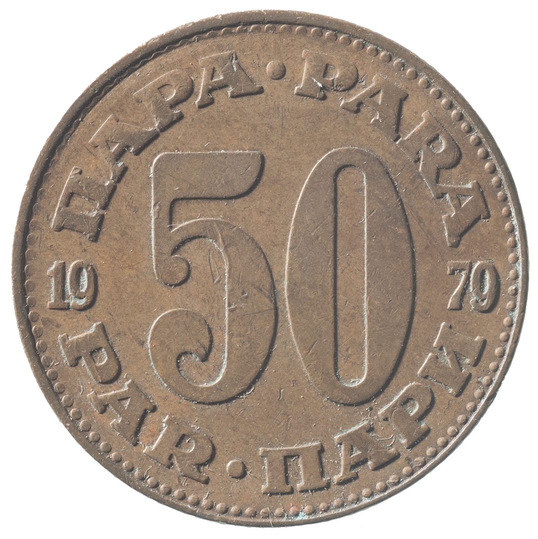 U sredini broj 50 (nominala), a oko njega tekst PARA na četiri jezika. U sredini uz lijevi i desni rub upisana godina 1979.