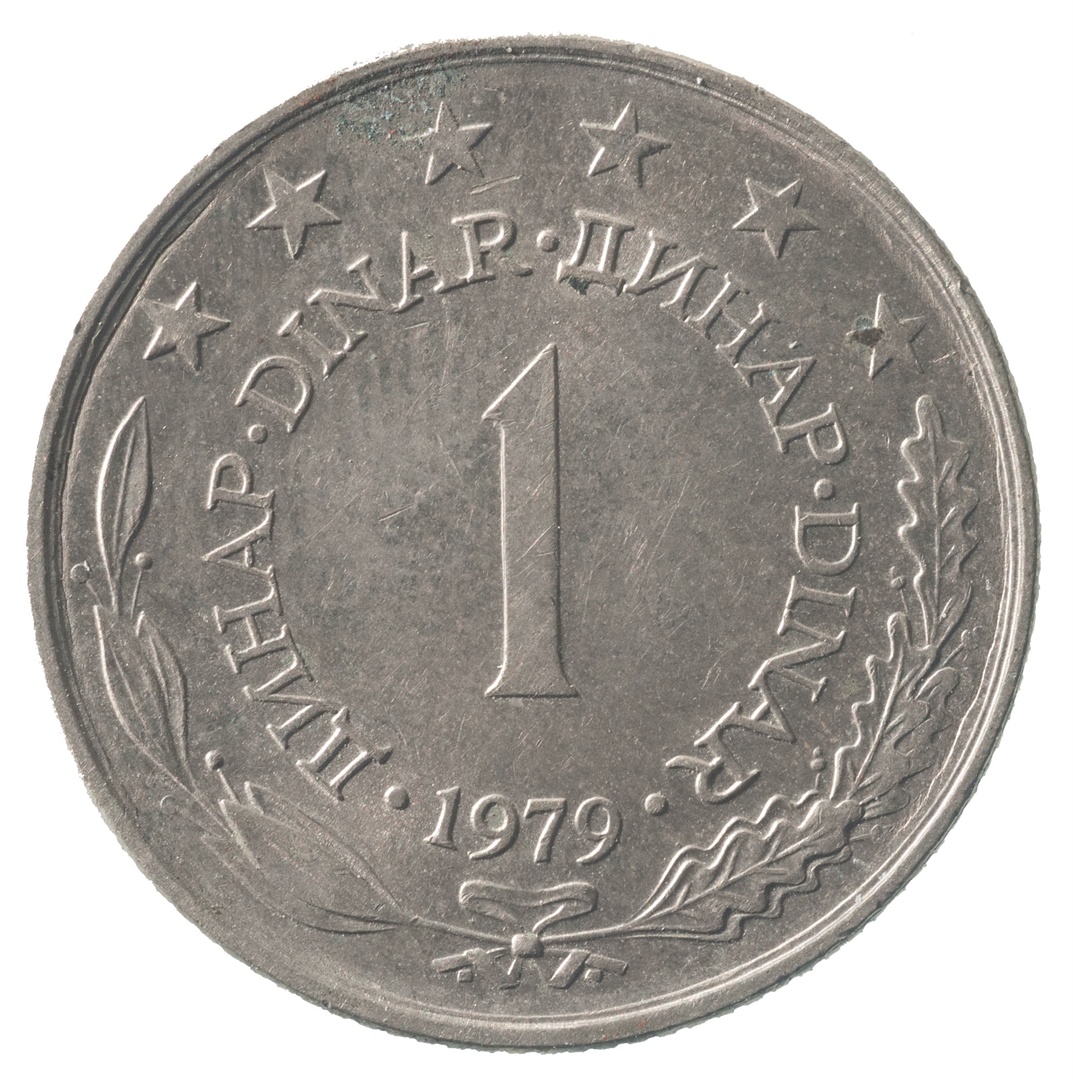 U sredini broj 1 (nominala), oko njega tekst DINAR na četiri jezika, a ispod toga godina 1979. Duž gornjeg ruba polukružno poredano 6 petokrakih zvjezdi.