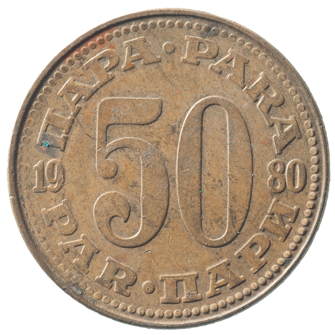 U sredini broj 50 (nominala), a oko njega tekst PARA na četiri jezika. U sredini uz lijevi i desni rub upisana godina 1980.
