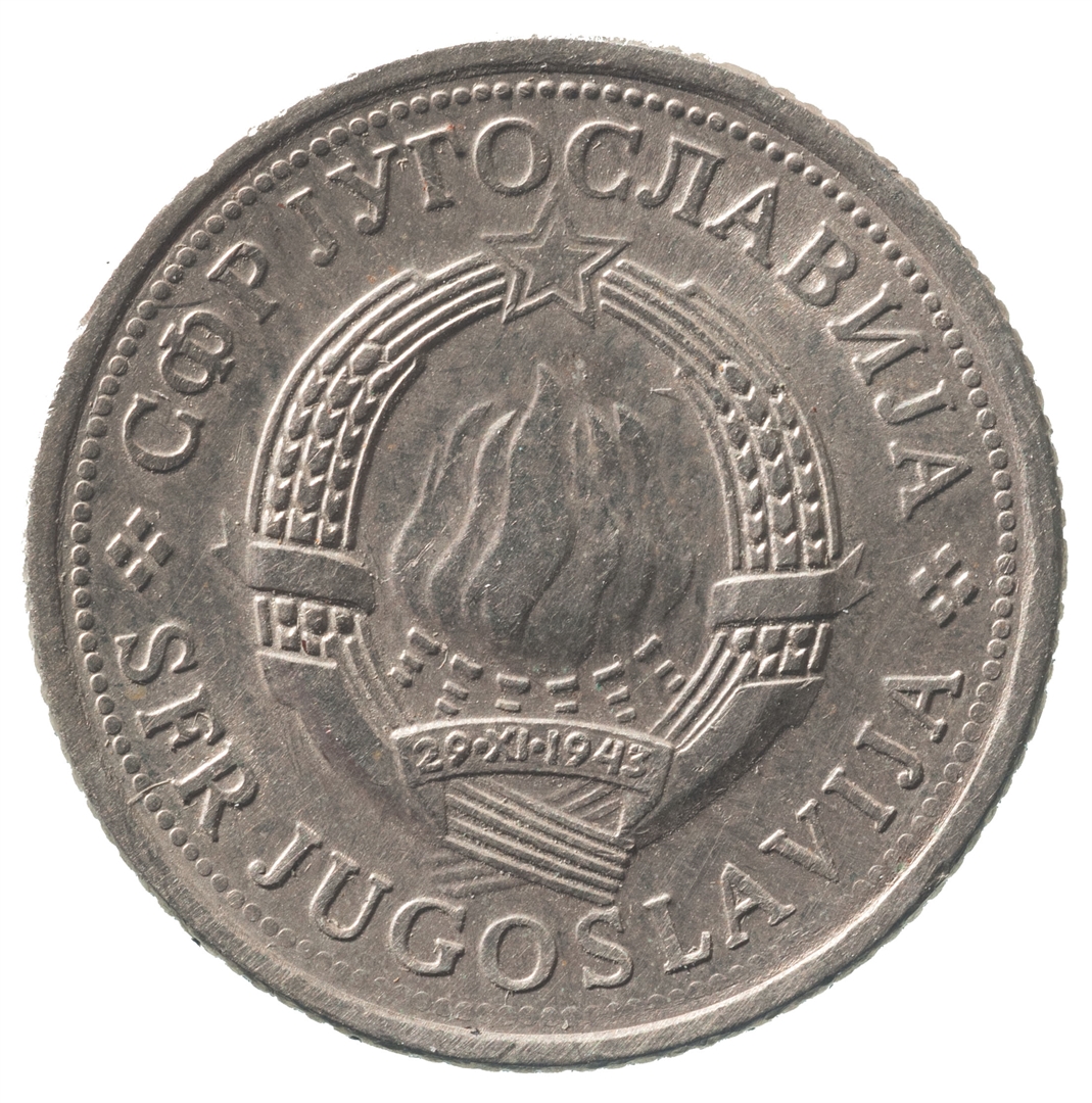 Avers: U sredini državni grb. U gornjem djelu uz rub polukružno napisan tekst SFR JUGOSLAVIJA na latinici i ćirilici. Revers: U sredini broj 1 (nominala), oko njega tekst DINAR na četiri jezika, a ispod toga godina 1980. Duž gornjeg ruba polukružno poredano 6 petokrakih zvjezdi.