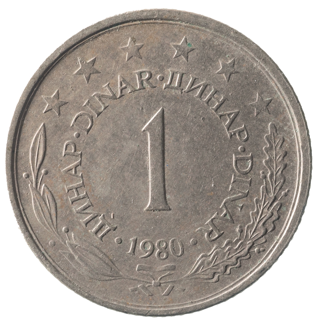U sredini broj 1 (nominala), oko njega tekst DINAR na četiri jezika, a ispod toga godina 1980. Duž gornjeg ruba polukružno poredano 6 petokrakih zvjezdi.