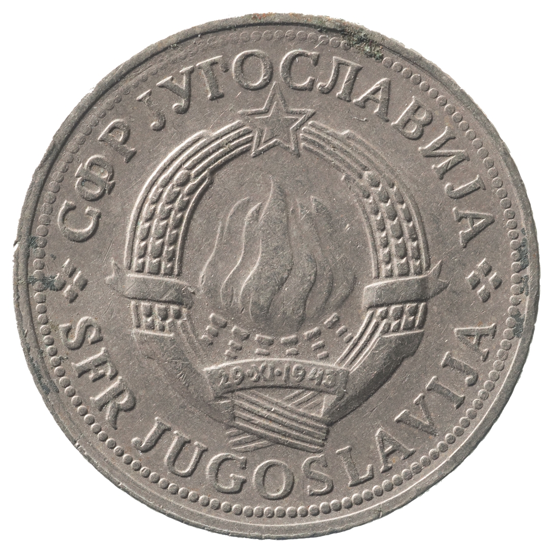 U sredini državni grb. U oko njega uz rub polukružno napisan tekst SFR JUGOSLAVIJA na latinici i ćirilici.