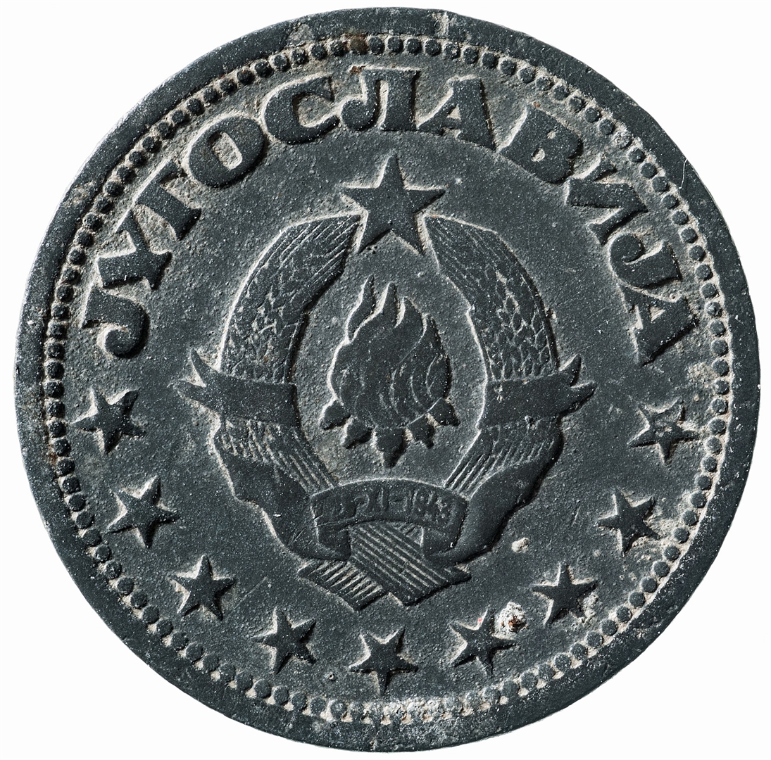 U sredini državni grb. U gornjem djelu uz rub polukružno napisan tekst JUGOSLAVIJA na ćirilici, a uz donji rub polukružno poredano 9 petokrakih zvjezdi.