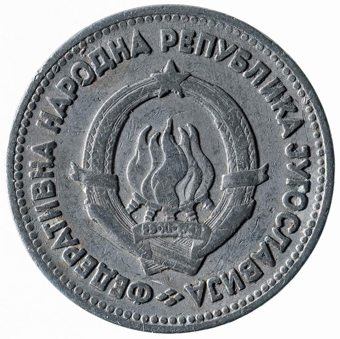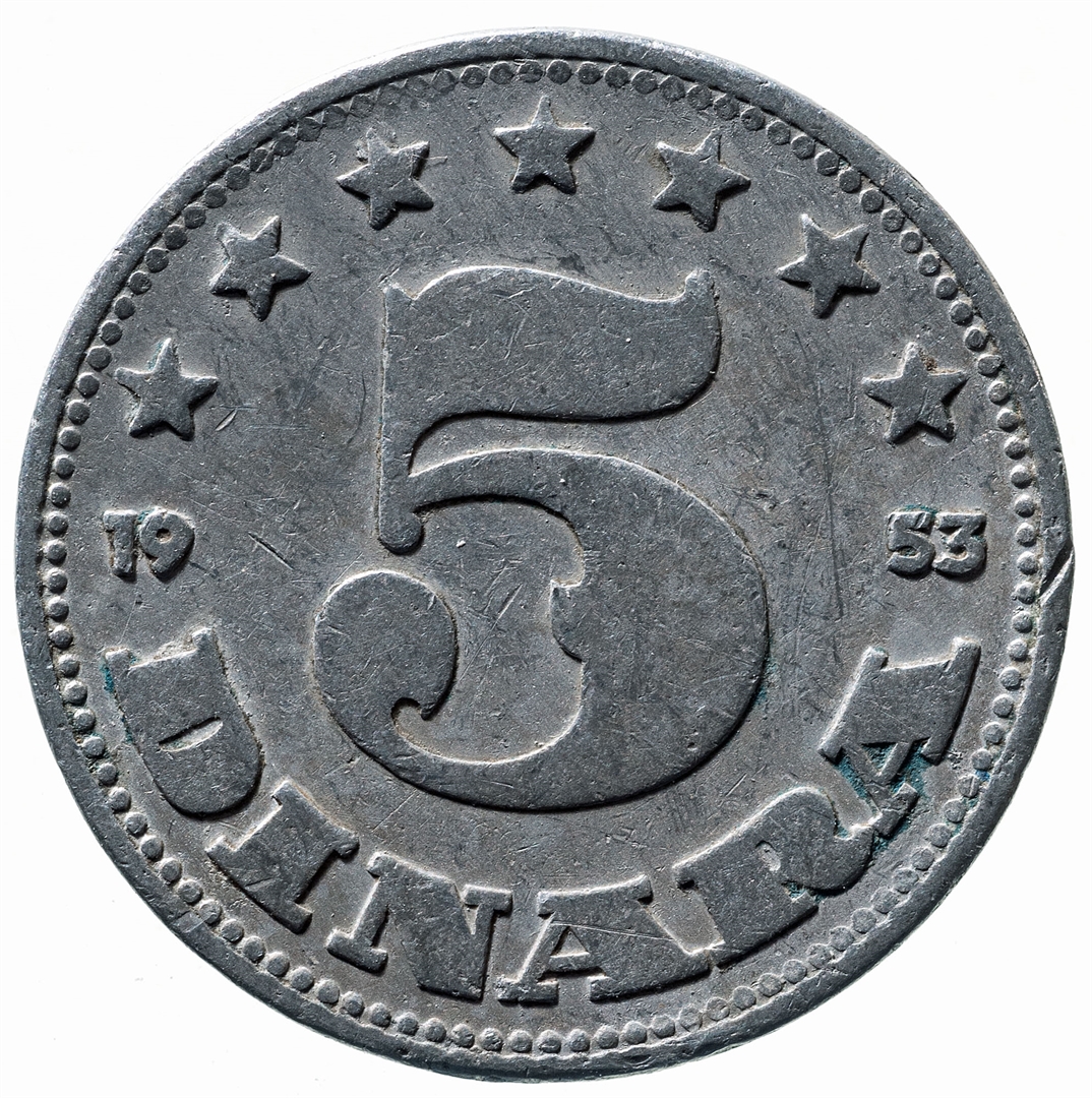 U sredini broj 5 (nominala), a ispod njega tekst DINARA. Duž cijelog gornjeg ruba polukružno poredano 8 petokrakih zvjezdi. U sredini uz lijevi i desni rub upisana godina 1953.