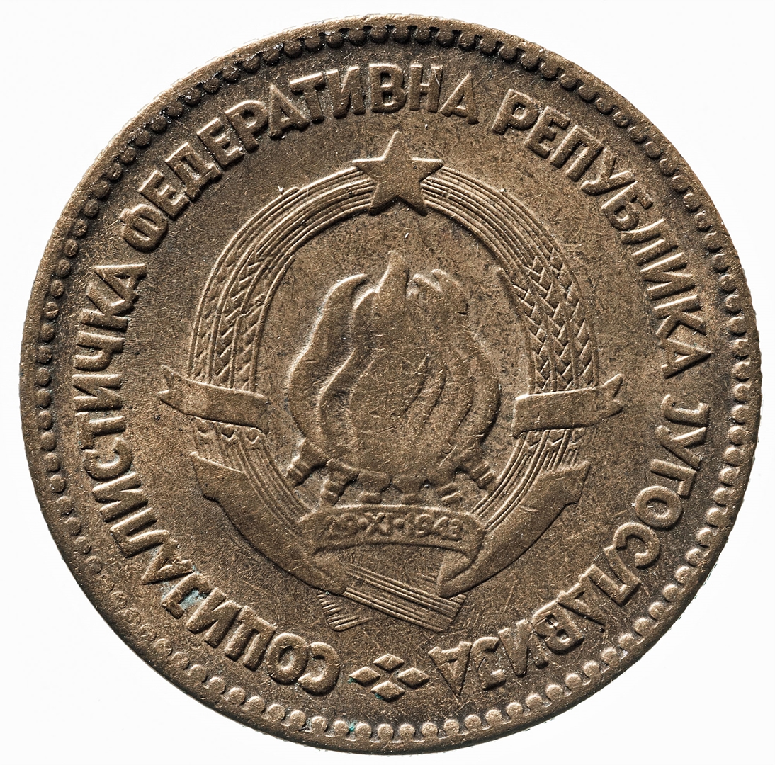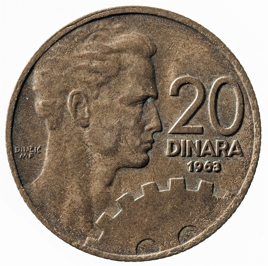 Avers: U sredini državni grb. U gornjem djelu uz rub polukružno napisan tekst SOCIJALISTIČKA FEDERATIVNA REPUBLIKA JUGOSLAVIJA na ćirilici. Revers: Prikaz radnika uz stroj u profilu.Uz rub broj 20 (nominala), a ispod njega tekst DINARA i godina 1963.