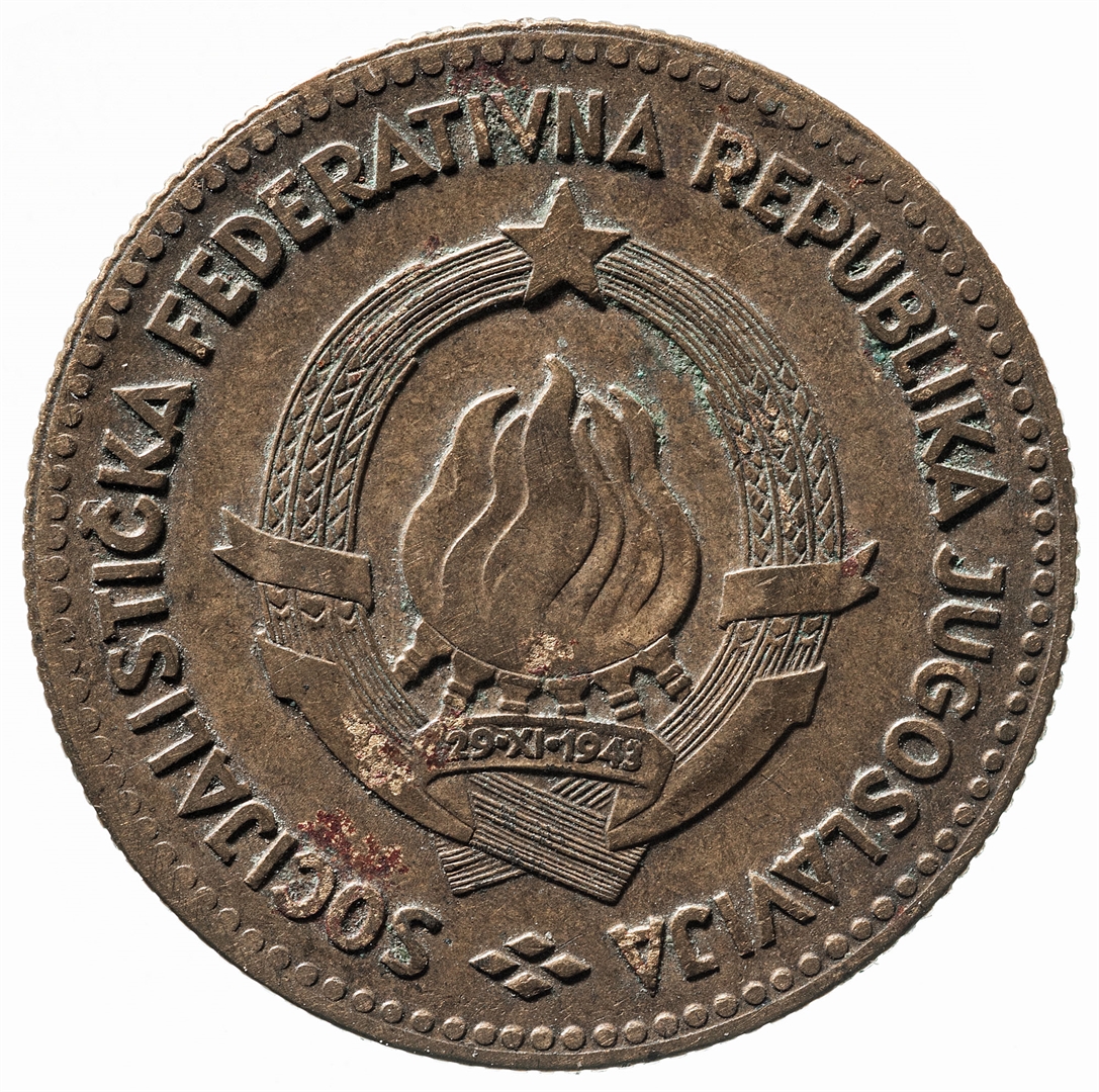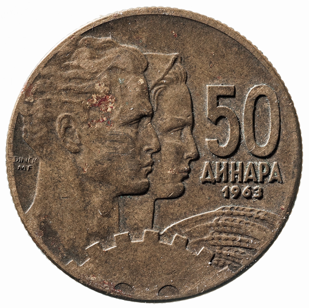 Avers: U sredini državni grb. U gornjem djelu uz rub polukružno napisan tekst SOCIJALISTIČKA FEDERATIVNA REPUBLIKA JUGOSLAVIJA. Revers: Prikaz seljanke koja drži žito i radnika uz stroj u profilu.Uz rub broj 50 (nominala), a ispod njega tekst DINARA na ćirilici i godina 1963.