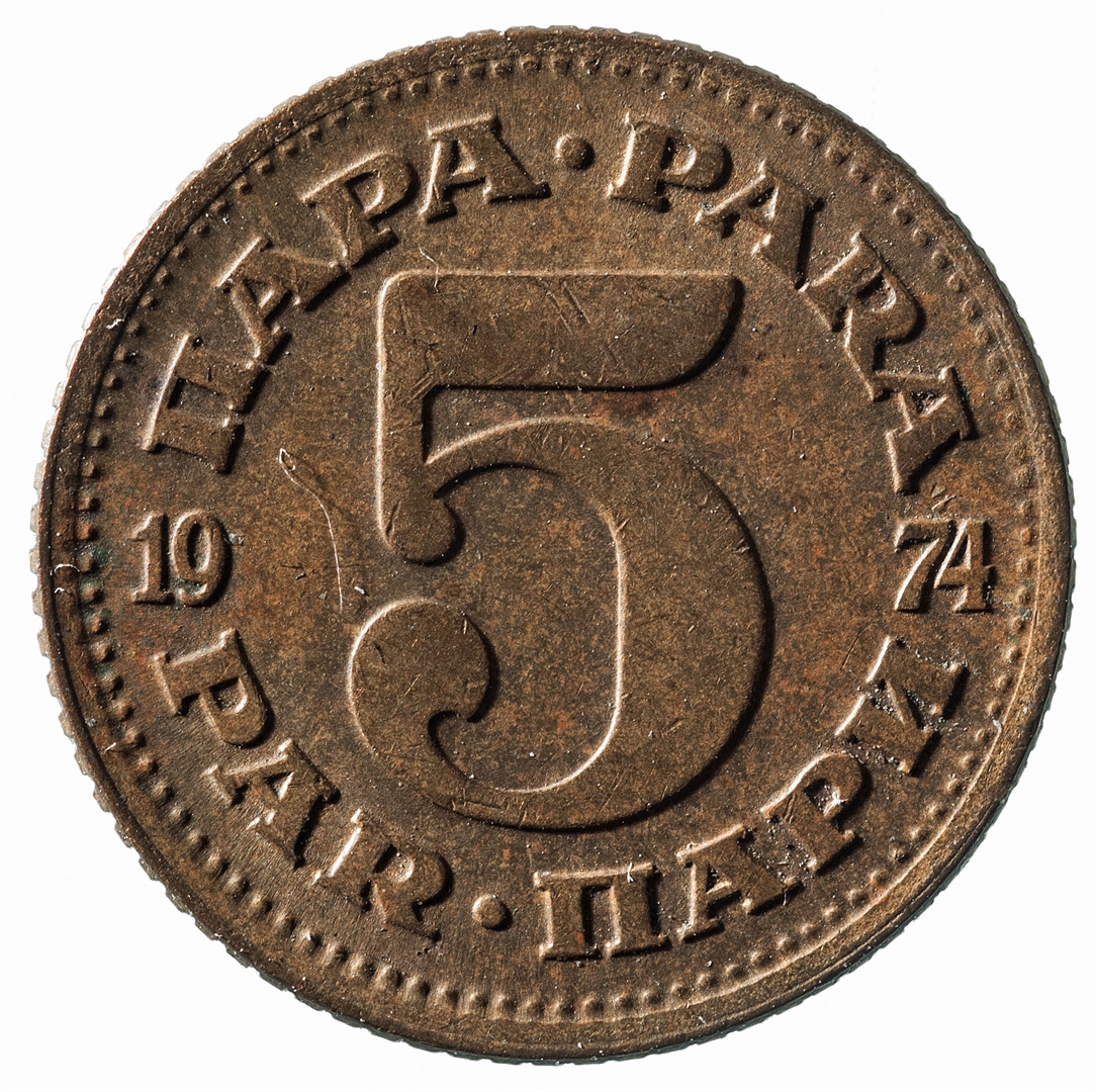 Avers: U sredini državni grb. U gornjem djelu uz rub polukružno napisan tekst SFR JUGOSLAVIJA na latinici i ćirilici. Revers: U sredini broj 5 (nominala), a oko njega tekst PARA na četiri jezika. U sredini uz lijevi i desni rub upisana godina 1974.