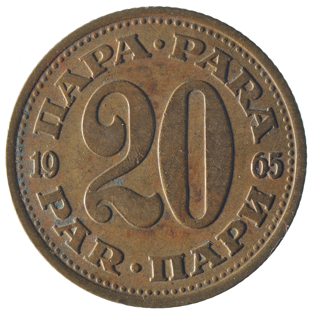 U sredini broj 20 (nominala), a oko njega tekst PARA na četiri jezika. U sredini uz lijevi i desni rub upisana godina 1965.