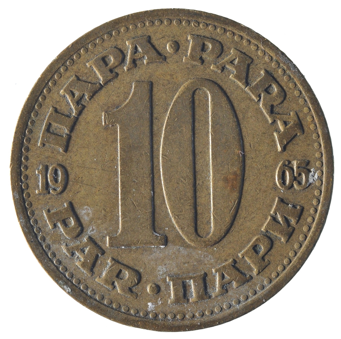 U sredini broj 10 (nominala), a oko njega tekst PARA na četiri jezika. U sredini uz lijevi i desni rub upisana godina 1965.