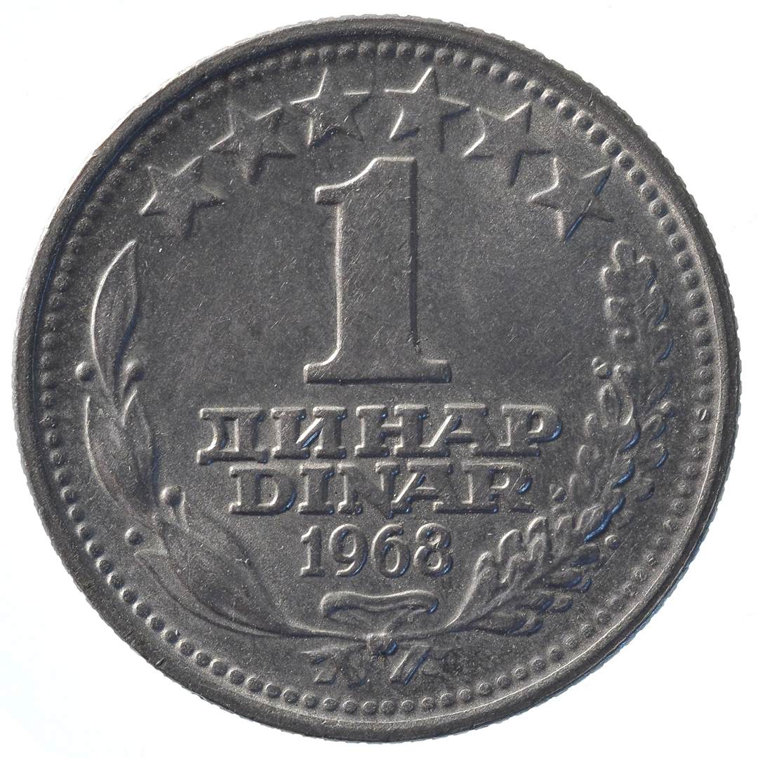 U sredini broj 1 (nominala), a ispod njega tekst DINAR na ćerilici i latinici, a ispod toga godina 1968. Duž gornjeg ruba polukružno poredano 5 petokrakih zvjezdi.