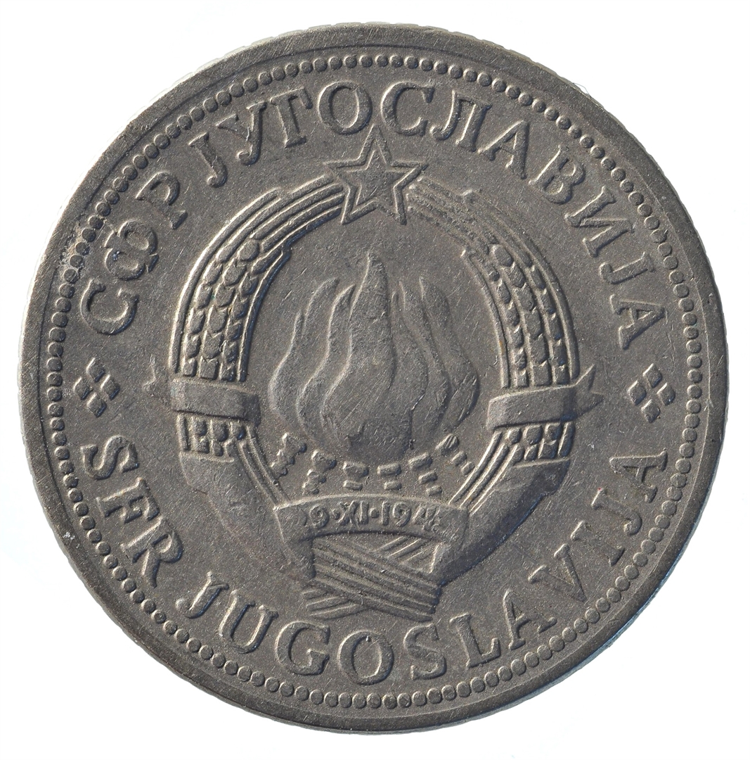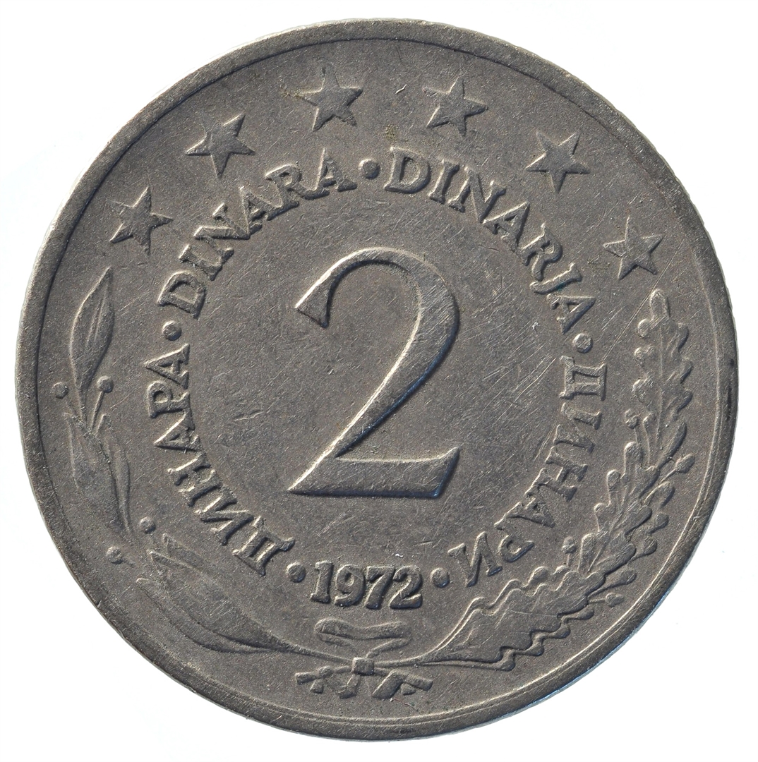 Avers: U sredini državni grb. U oko njega uz rub polukružno napisan tekst SFR JUGOSLAVIJA na latinici i ćirilici. Revers: U sredini broj 2 (nominala), oko njega tekst DINAR na četiri jezika, a ispod toga godina 1972. Duž gornjeg ruba polukružno poredano 6 petokrakih zvjezdi.