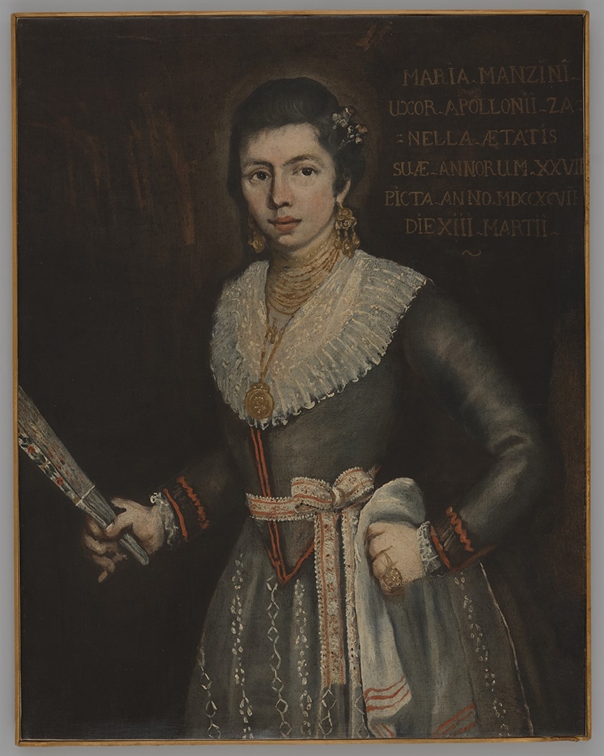Portre žene. Crna kosa sa ukrasom od metala i perli na njenu levu stranu velike naušnice sa tri privjesaka na svakoj. Oko vrata ogrlica sa puno niza perli. Na prsima okrugli privjesak od zlata. Veliki okovratnik kao šal od čipke. Haljina tamna sa crvenim vrpcama na grudima i na kraju rukava. Suknja sa vertikalnim vezama. O pasu izvezena kanica. U desnoj ruci lepeza. Lijeva ruka položena na kuku ima prsten na malom prstu i burma na prstenjaku. U gornjem desnom uglu natpis: Maria Manzini. Uxor Apolloni - nella aetatis suae. annorum XXVII picta anno MDCCXCVII die XIII martii. (Inventarna knjiga 1-3, 2. tom)