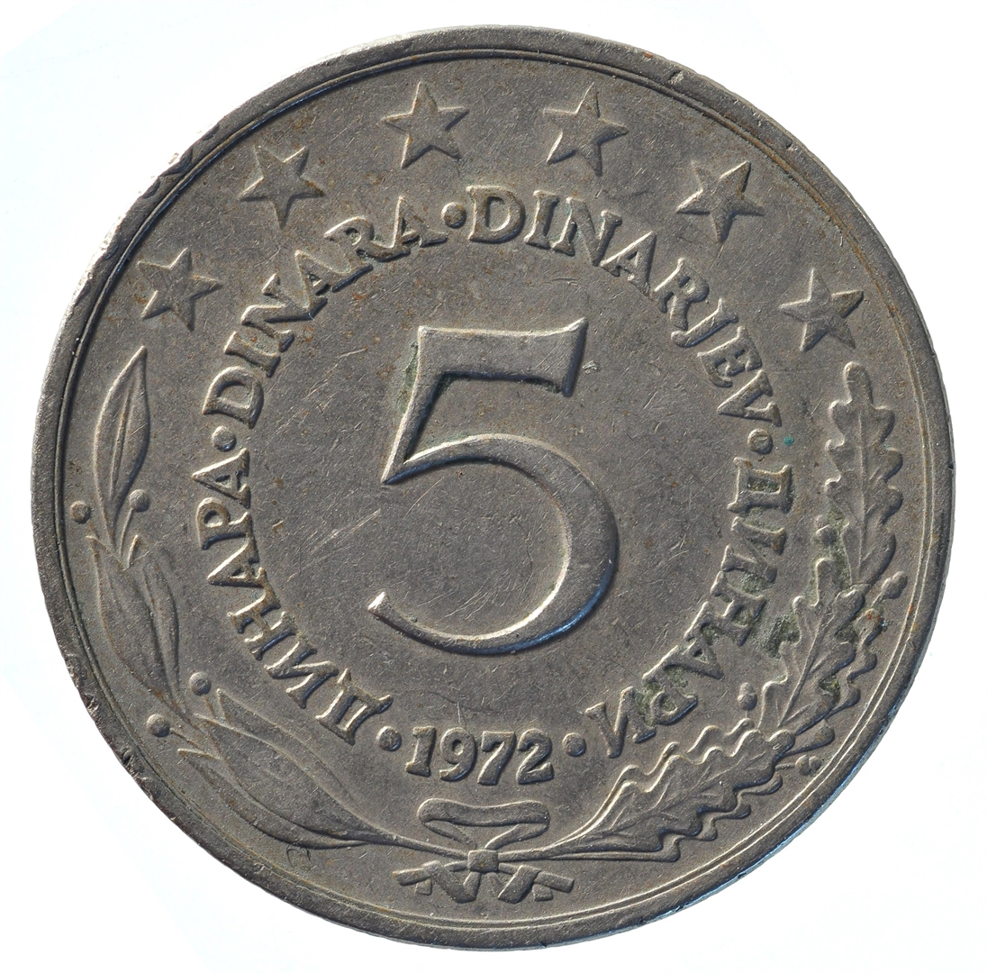 U sredini broj 5 (nominala), oko njega tekst DINAR na četiri jezika, a ispod toga godina 1976. Duž gornjeg ruba polukružno poredano 6 petokrakih zvjezdi.