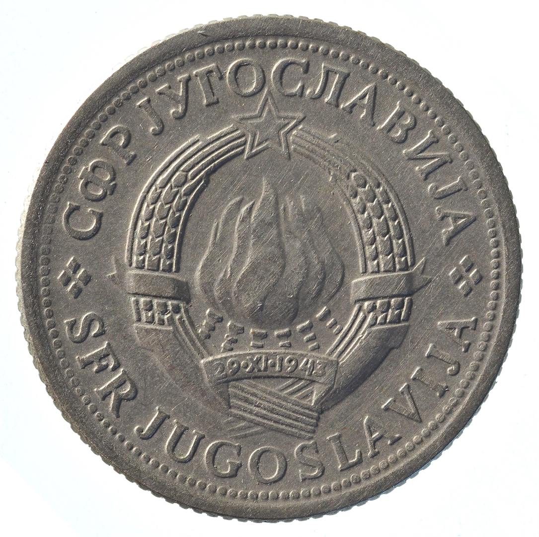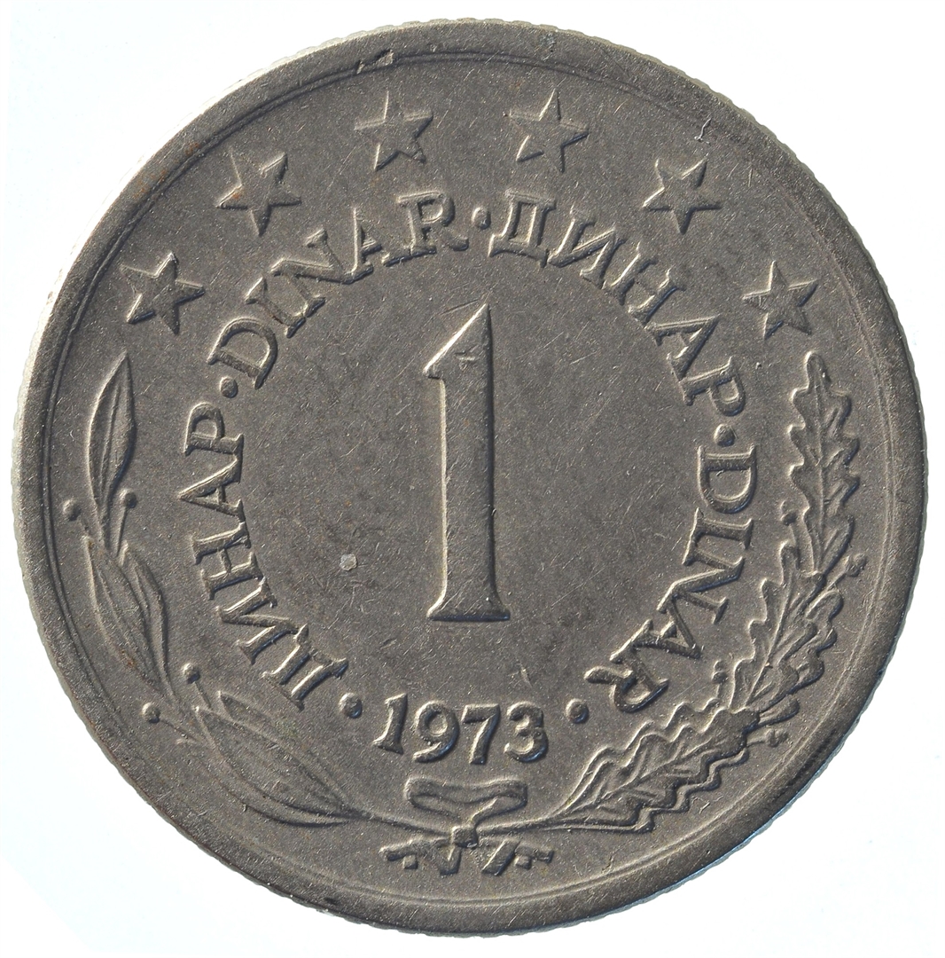 U sredini broj 1 (nominala), oko njega tekst DINAR na četiri jezika, a ispod toga godina 1973. Duž gornjeg ruba polukružno poredano 6 petokrakih zvjezdi.