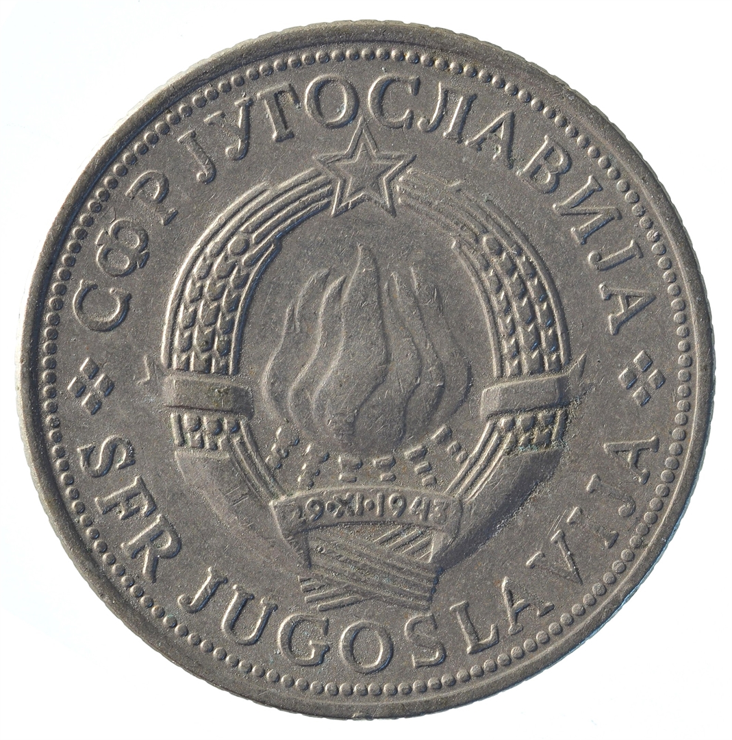 U sredini državni grb. U oko njega uz rub polukružno napisan tekst SFR JUGOSLAVIJA na latinici i ćirilici.