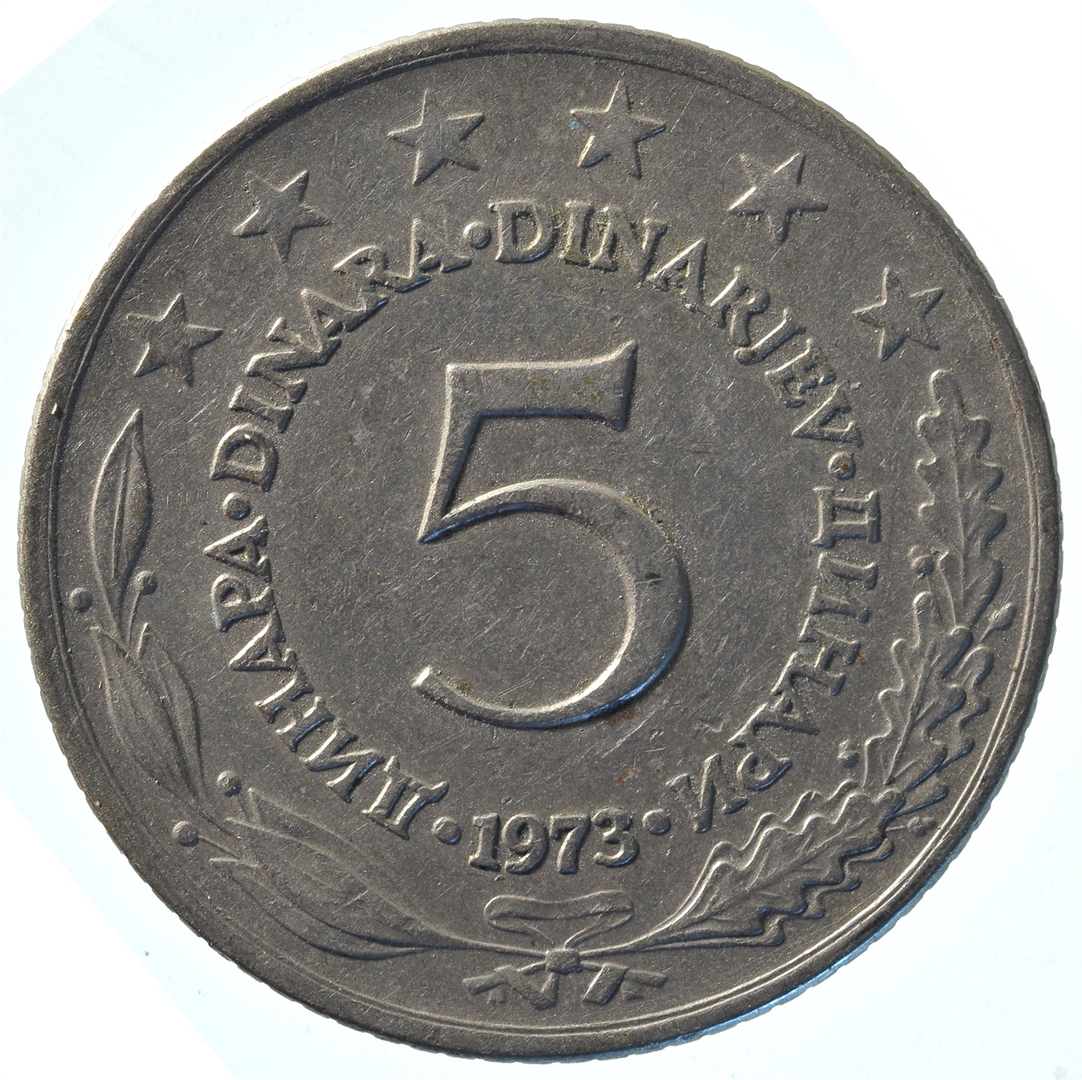 U sredini broj 5 (nominala), oko njega tekst DINAR na četiri jezika, a ispod toga godina 1973. Duž gornjeg ruba polukružno poredano 6 petokrakih zvjezdi.