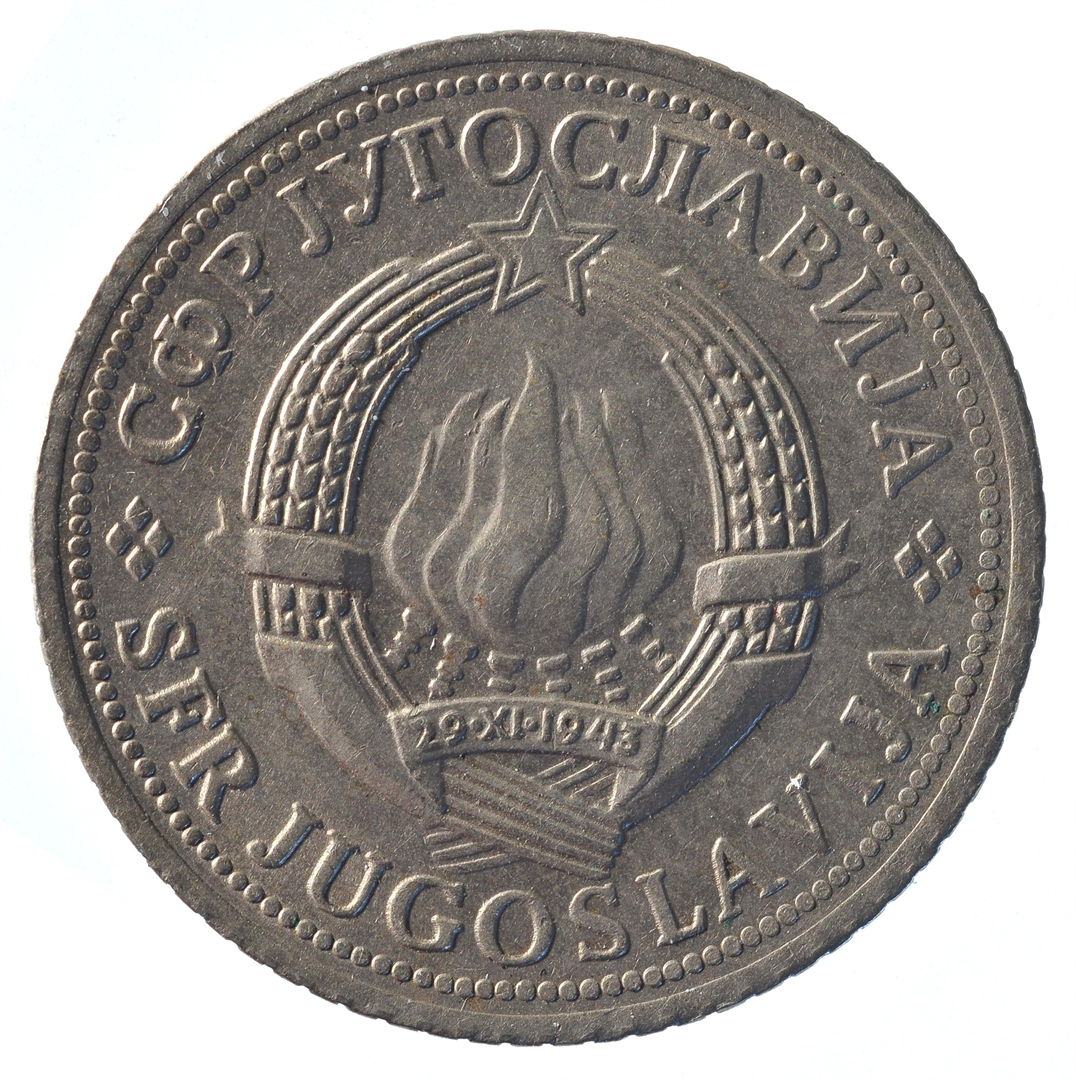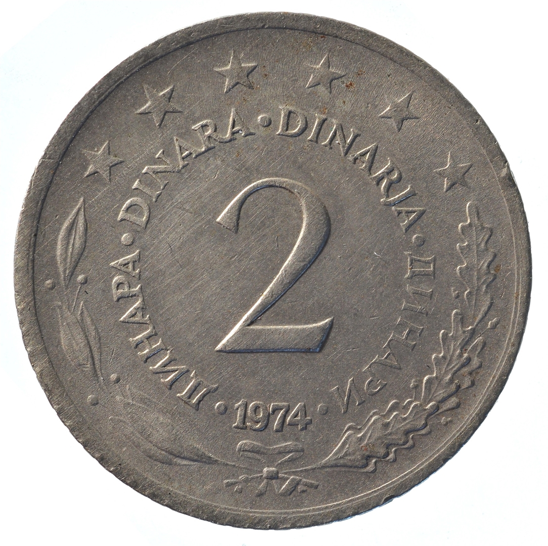Avers: U sredini državni grb. U oko njega uz rub polukružno napisan tekst SFR JUGOSLAVIJA na latinici i ćirilici. Revers: U sredini broj 2 (nominala), oko njega tekst DINAR na četiri jezika, a ispod toga godina 1974. Duž gornjeg ruba polukružno poredano 6 petokrakih zvjezdi.