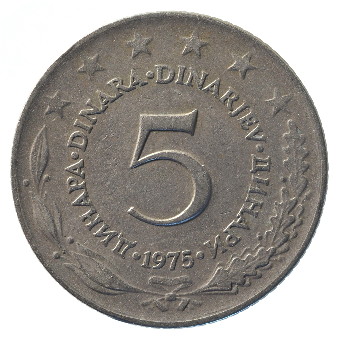 U sredini broj 5 (nominala), oko njega tekst DINAR na četiri jezika, a ispod toga godina 1975. Duž gornjeg ruba polukružno poredano 6 petokrakih zvjezdi.