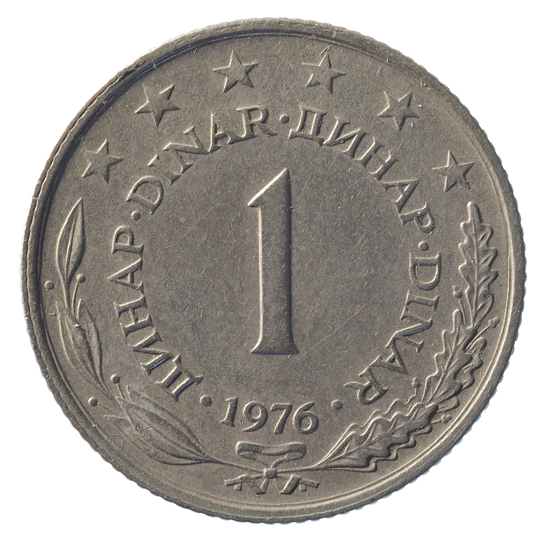 U sredini broj 1 (nominala), oko njega tekst DINAR na četiri jezika, a ispod toga godina 1976. Duž gornjeg ruba polukružno poredano 6 petokrakih zvjezdi.