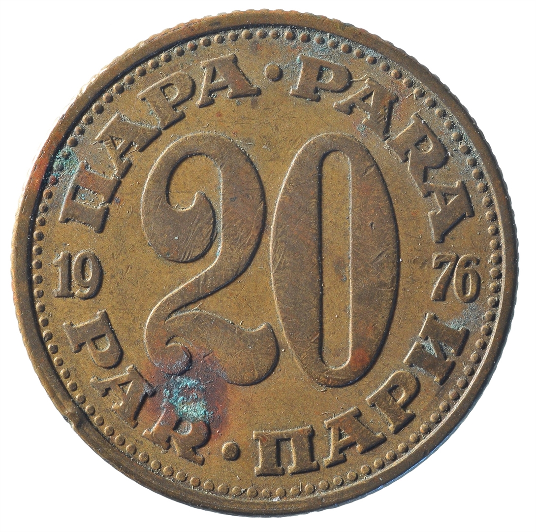 Avers: U sredini državni grb. U gornjem djelu uz rub polukružno napisan tekst SFR JUGOSLAVIJA na latinici i ćirilici. Revers: U sredini broj 20 (nominala), a oko njega tekst PARA na četiri jezika. U sredini uz lijevi i desni rub upisana godina 1976.
