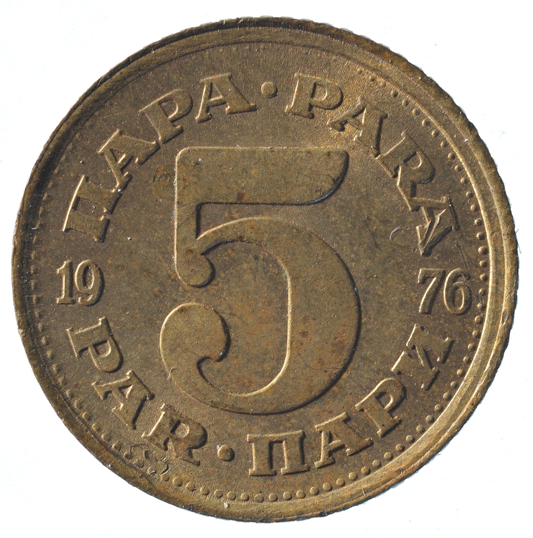U sredini broj 5 (nominala), a oko njega tekst PARA na četiri jezika. U sredini uz lijevi i desni rub upisana godina 1976.