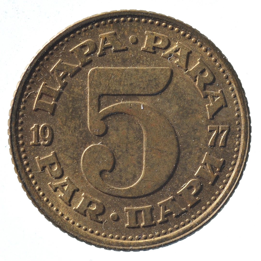U sredini broj 5 (nominala), a oko njega tekst PARA na četiri jezika. U sredini uz lijevi i desni rub upisana godina 1977.