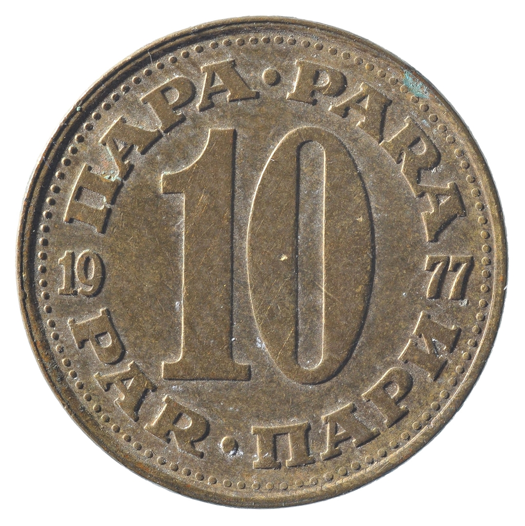 Avers: U sredini državni grb. U gornjem djelu uz rub polukružno napisan tekst SFR JUGOSLAVIJA na latinici i ćirilici. Revers: U sredini broj 10 (nominala), a oko njega tekst PARA na četiri jezika. U sredini uz lijevi i desni rub upisana godina 1977.