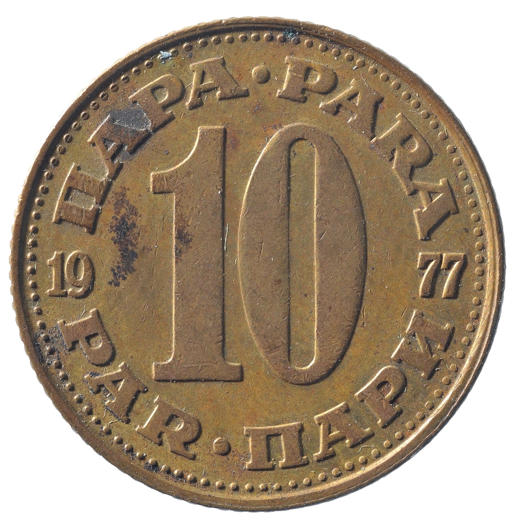 U sredini broj 10 (nominala), a oko njega tekst PARA na četiri jezika. U sredini uz lijevi i desni rub upisana godina 1977.