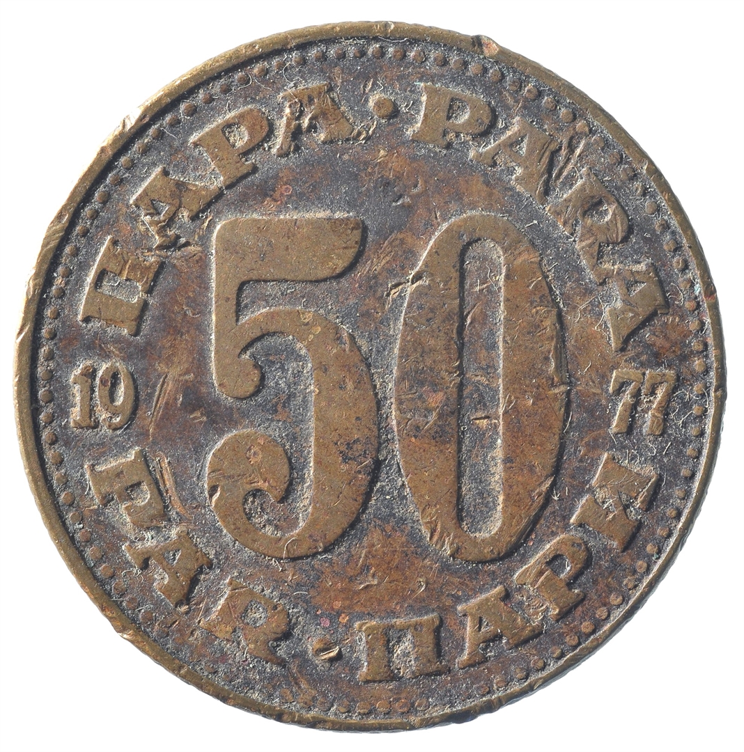 U sredini broj 50 (nominala), a oko njega tekst PARA na četiri jezika. U sredini uz lijevi i desni rub upisana godina 1977.
