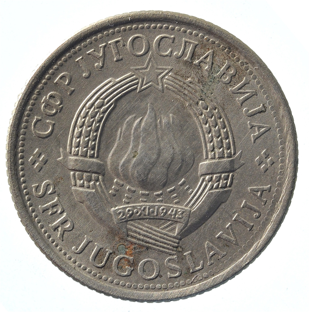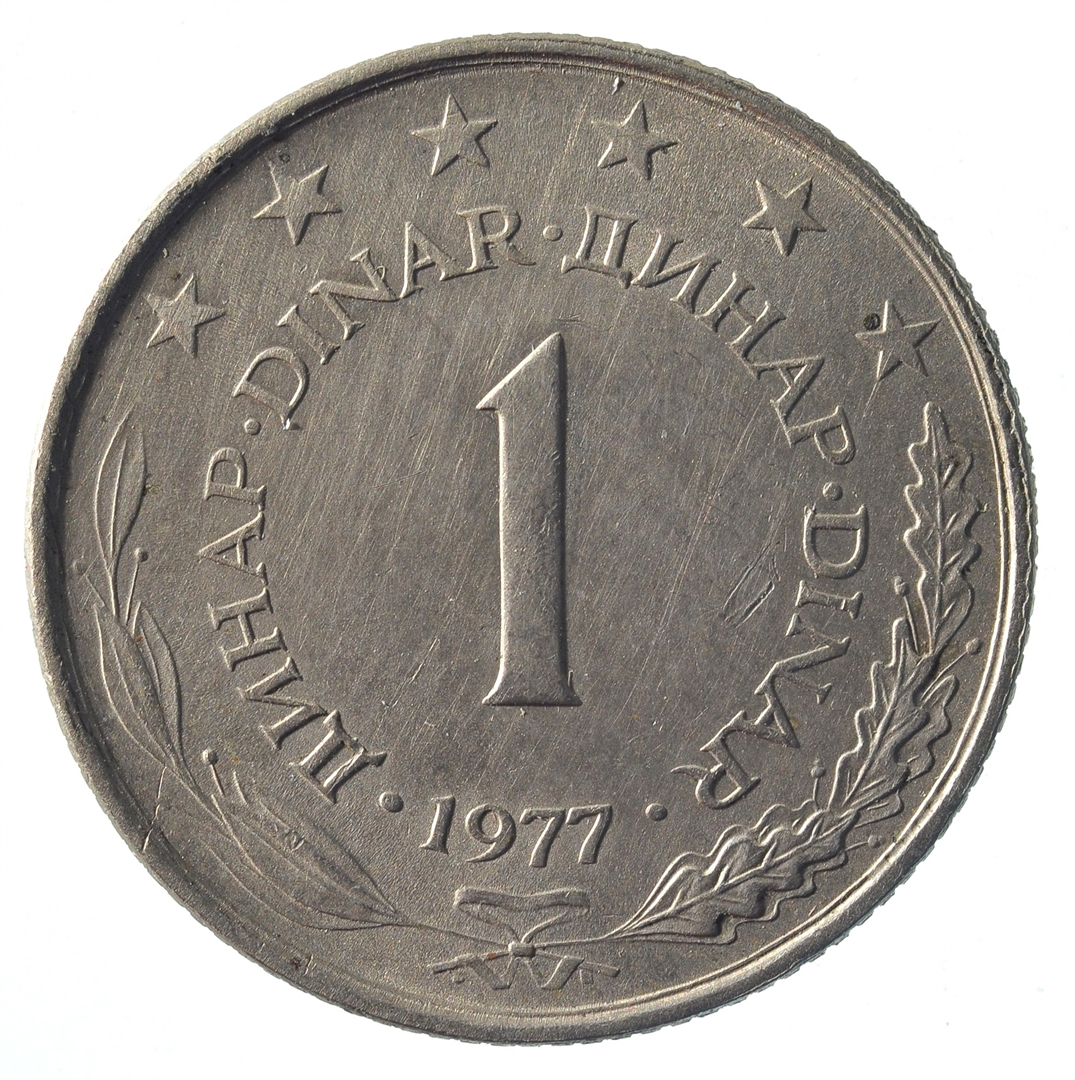 U sredini broj 1 (nominala), oko njega tekst DINAR na četiri jezika, a ispod toga godina 1977. Duž gornjeg ruba polukružno poredano 6 petokrakih zvjezdi.