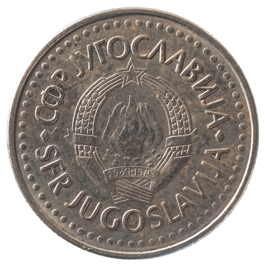 U sredini državni grb. Oko njega uz rub polukružno napisan tekst SFR JUGOSLAVIJA na latinici i ćirilici.