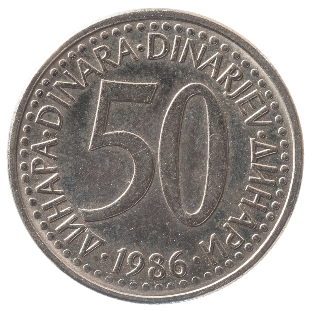 U sredini broj 50 (nominala), oko njega tekst DINAR na četiri jezika, a ispod toga godina 1986.