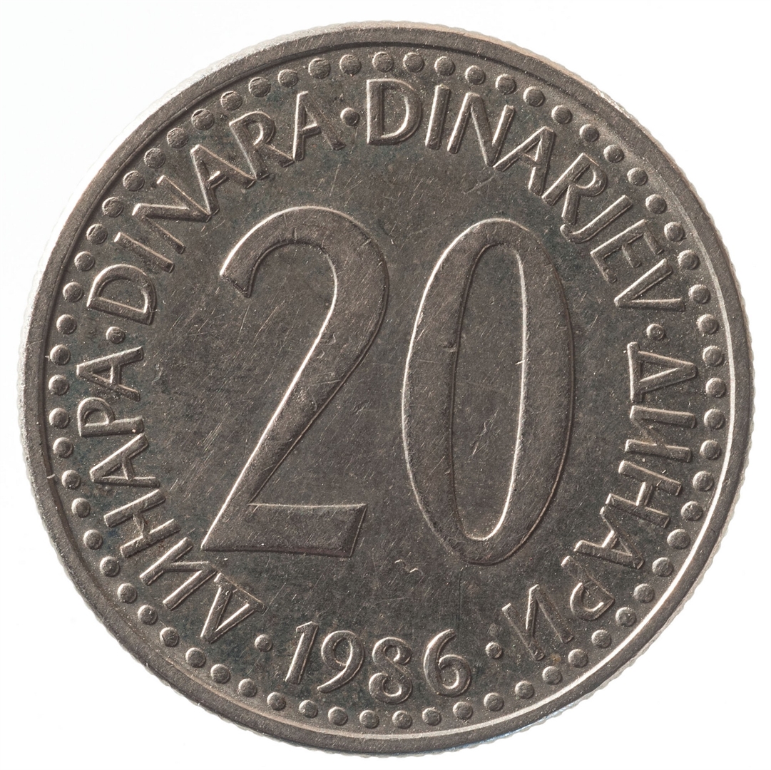 U sredini broj 20 (nominala), oko njega tekst DINAR na četiri jezika, a ispod toga godina 1986.