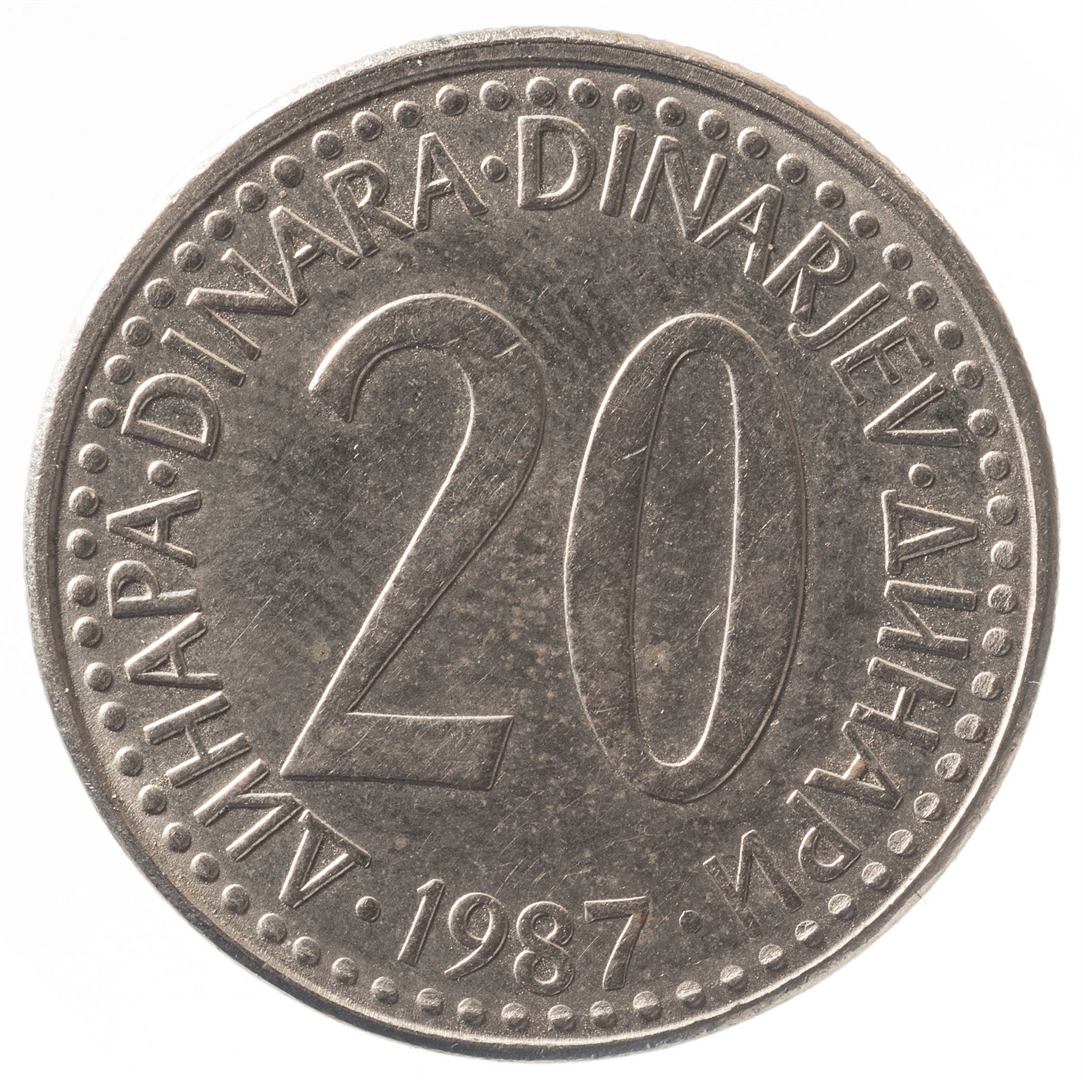 U sredini broj 20 (nominala), oko njega tekst DINAR na četiri jezika, a ispod toga godina 1987.