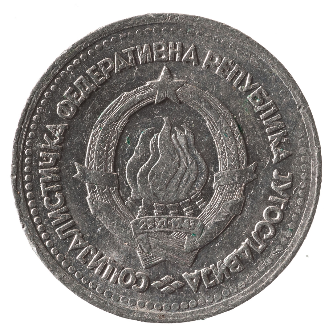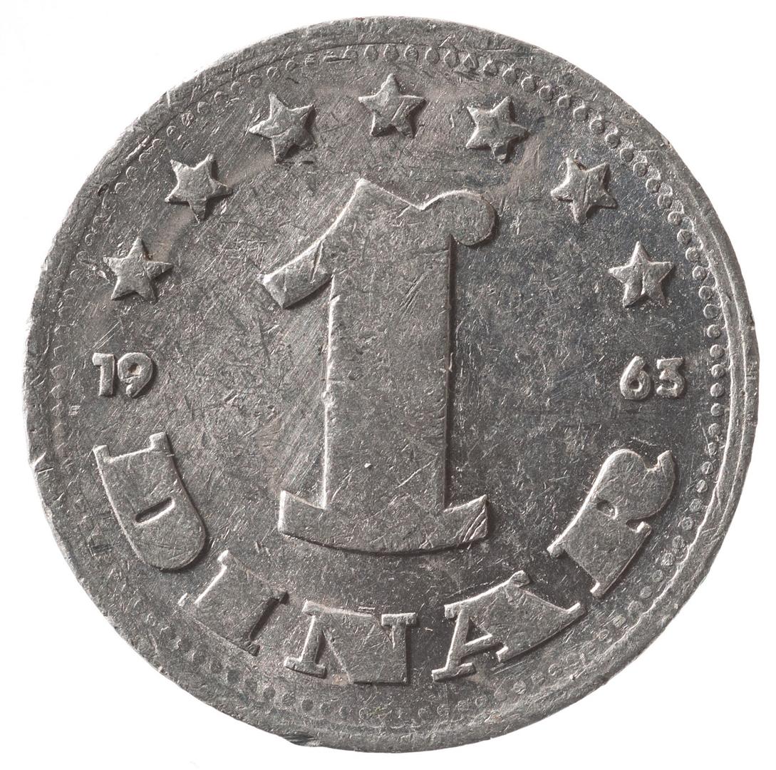 U sredini broj 1 (nominala), a ispod njega tekst DINARA. Duž cijelog gornjeg ruba polukružno poredano 7 petokrakih zvjezdi. U sredini uz lijevi i desni rub upisana godina 1963.