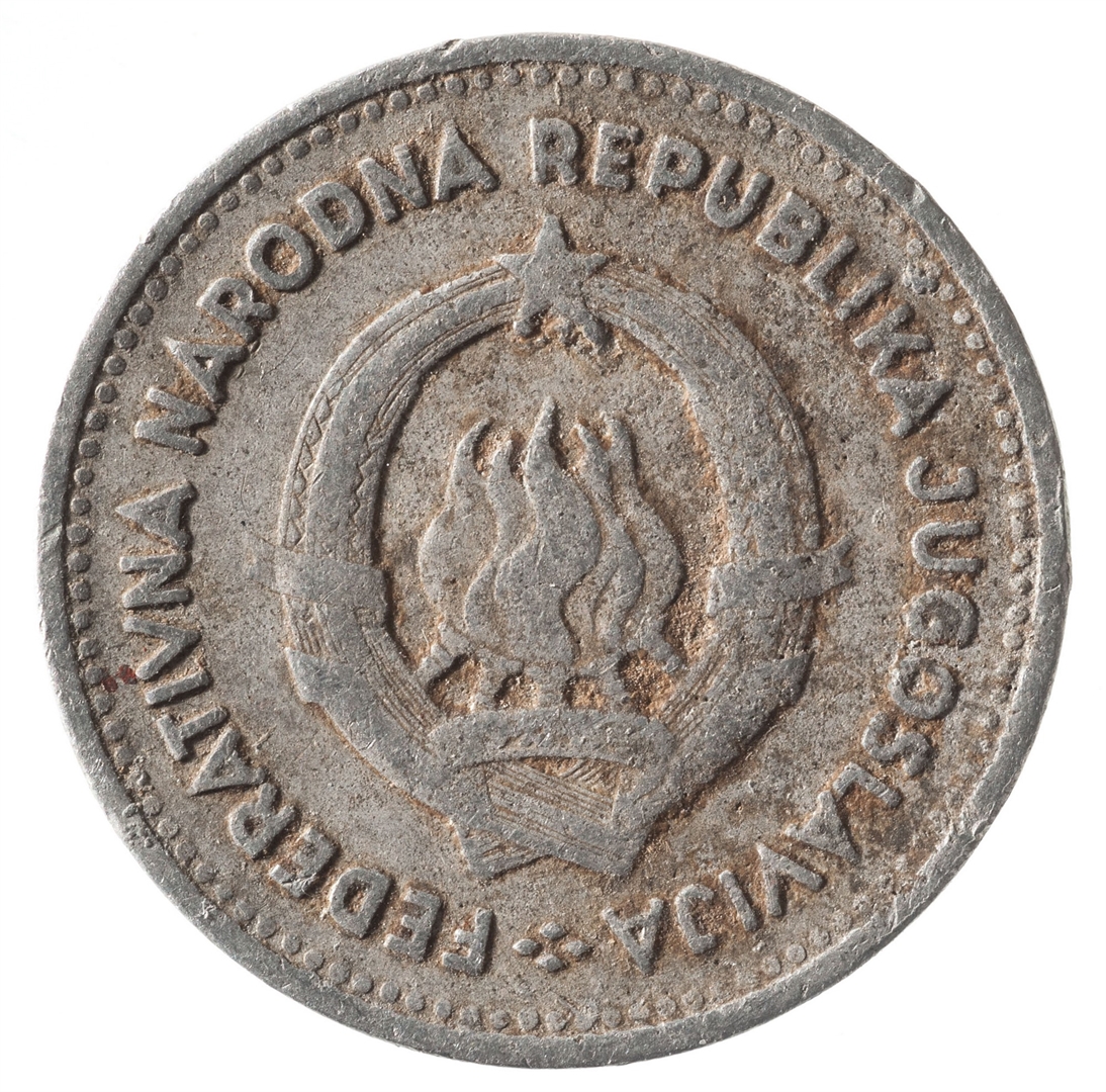 U sredini državni grb. U gornjem djelu uz rub polukružno napisan tekst FEDERATIVNA NARODNA REPUBLIKA JUGOSLAVIJA na ćirilici.