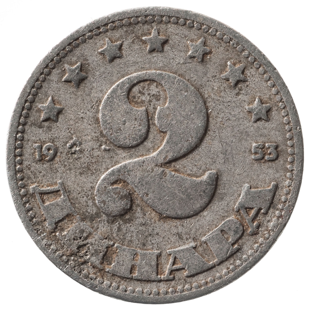 U sredini broj 2 (nominala), a ispod njega tekst DINARA. Duž cijelog gornjeg ruba polukružno poredano 8 petokrakih zvjezdi. U sredini uz lijevi i desni rub upisana godina 1953.
