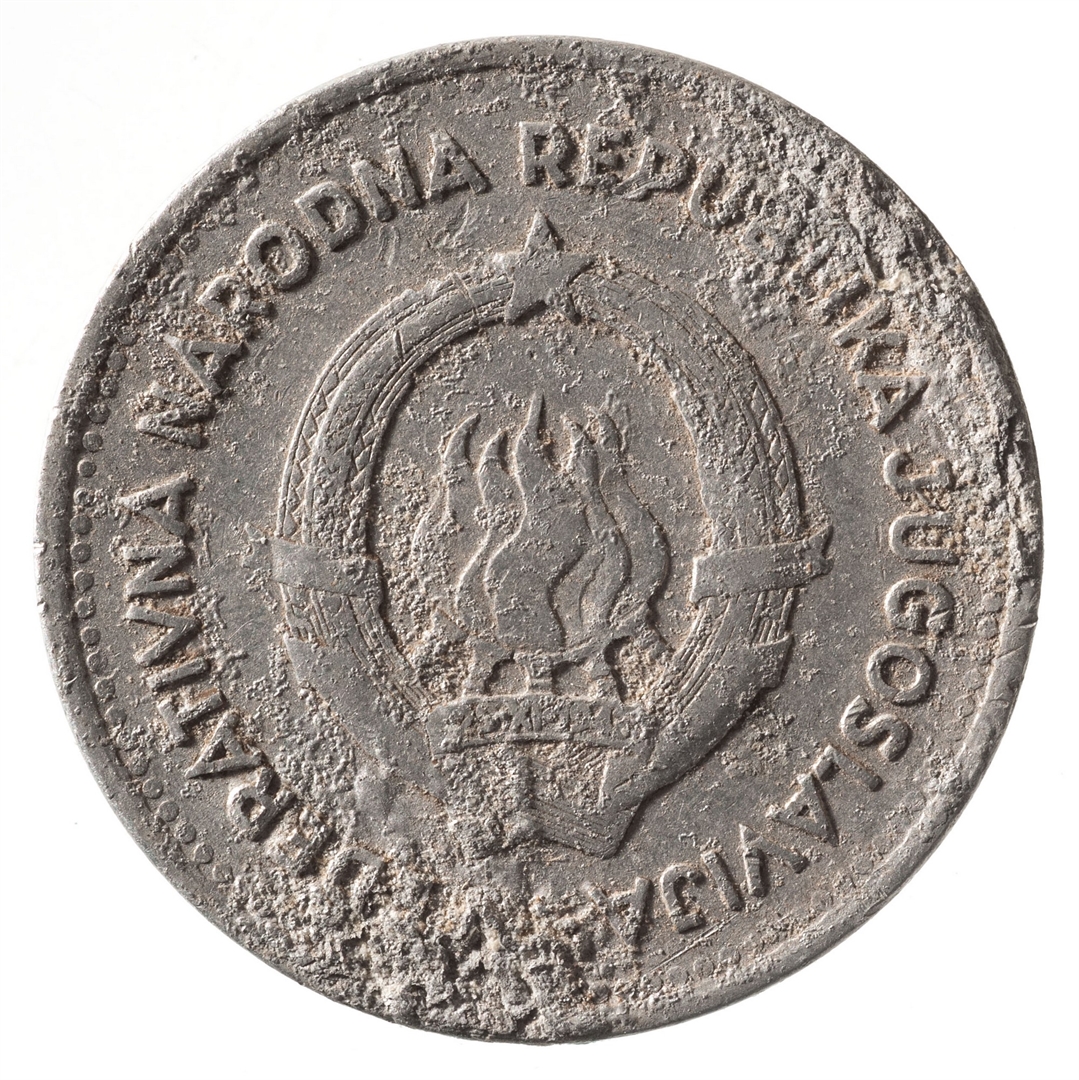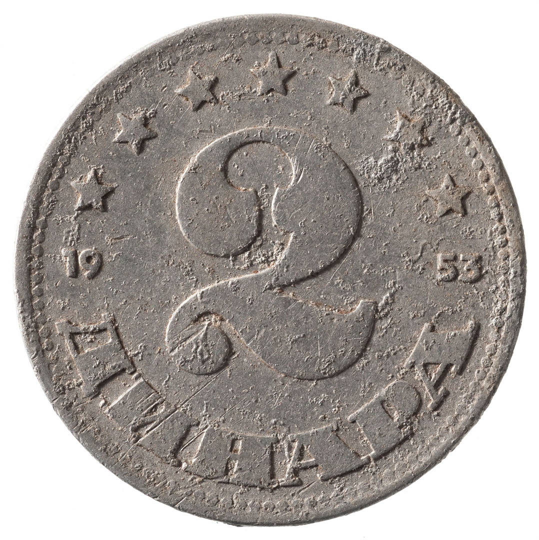 U sredini broj 2 (nominala), a ispod njega tekst DINARA. Duž cijelog gornjeg ruba polukružno poredano 8 petokrakih zvjezdi. U sredini uz lijevi i desni rub upisana godina 1953.
