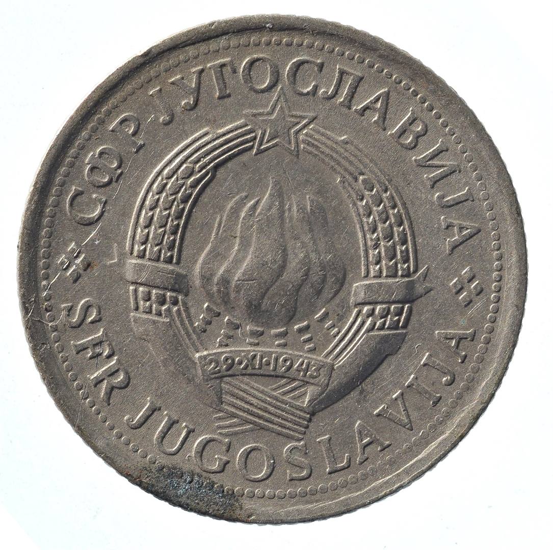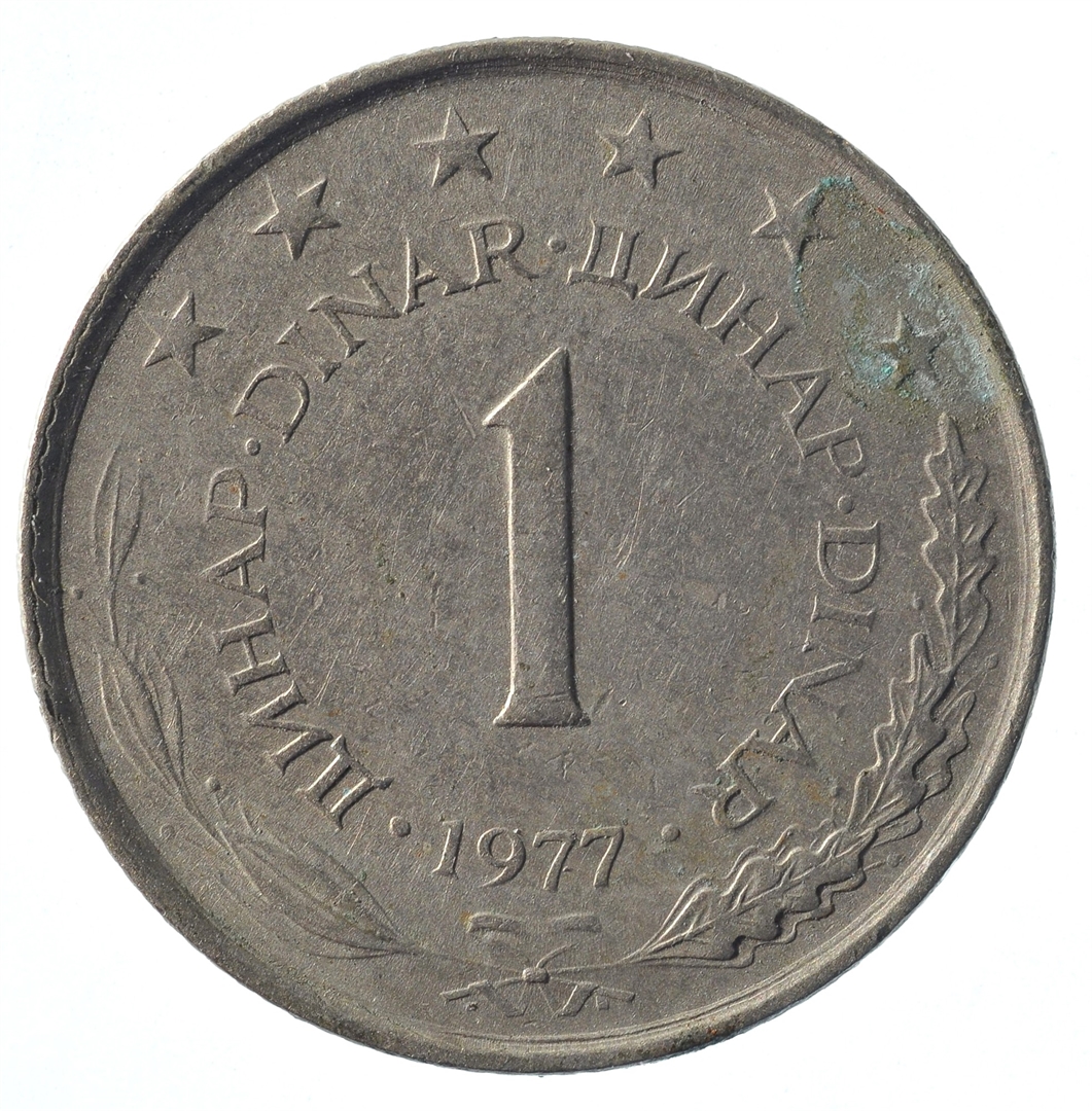 U sredini broj 1 (nominala), oko njega tekst DINAR na četiri jezika, a ispod toga godina 1977. Duž gornjeg ruba polukružno poredano 6 petokrakih zvjezdi.