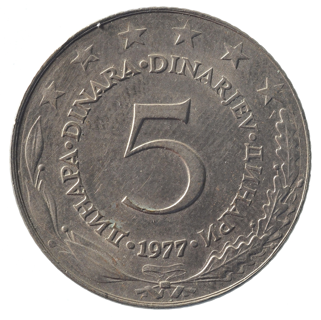 Avers: U sredini državni grb. U oko njega uz rub polukružno napisan tekst SFR JUGOSLAVIJA na latinici i ćirilici. Revers: U sredini broj 5 (nominala), oko njega tekst DINAR na četiri jezika, a ispod toga godina 1977. Duž gornjeg ruba polukružno poredano 6 petokrakih zvjezdi.