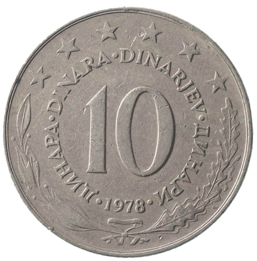 U sredini broj 10 (nominala), oko njega tekst DINAR na četiri jezika, a ispod toga godina 1978. Duž gornjeg ruba polukružno poredano 6 petokrakih zvjezdi.