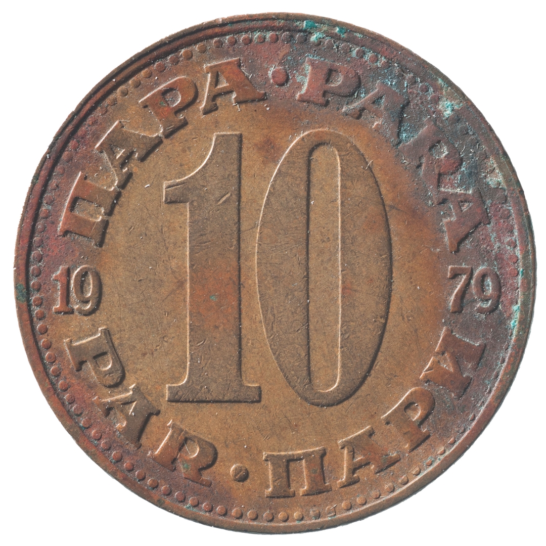 U sredini broj 10 (nominala), a oko njega tekst PARA na četiri jezika. U sredini uz lijevi i desni rub upisana godina 1979.