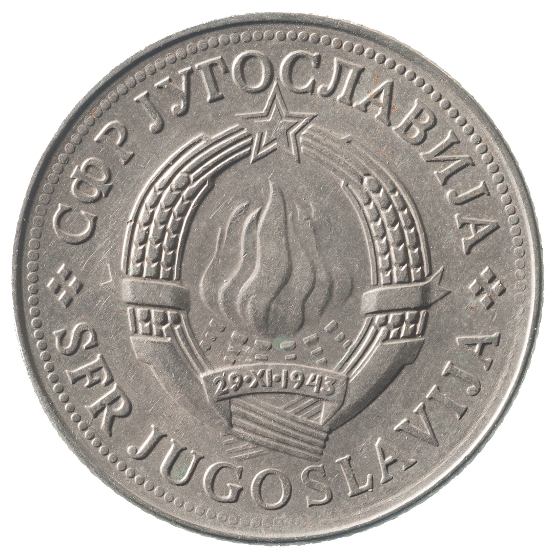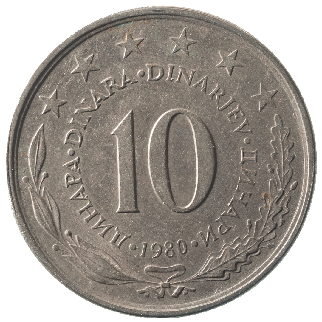 U sredini broj 10 (nominala), oko njega tekst DINAR na četiri jezika, a ispod toga godina 1980. Duž gornjeg ruba polukružno poredano 6 petokrakih zvjezdi.