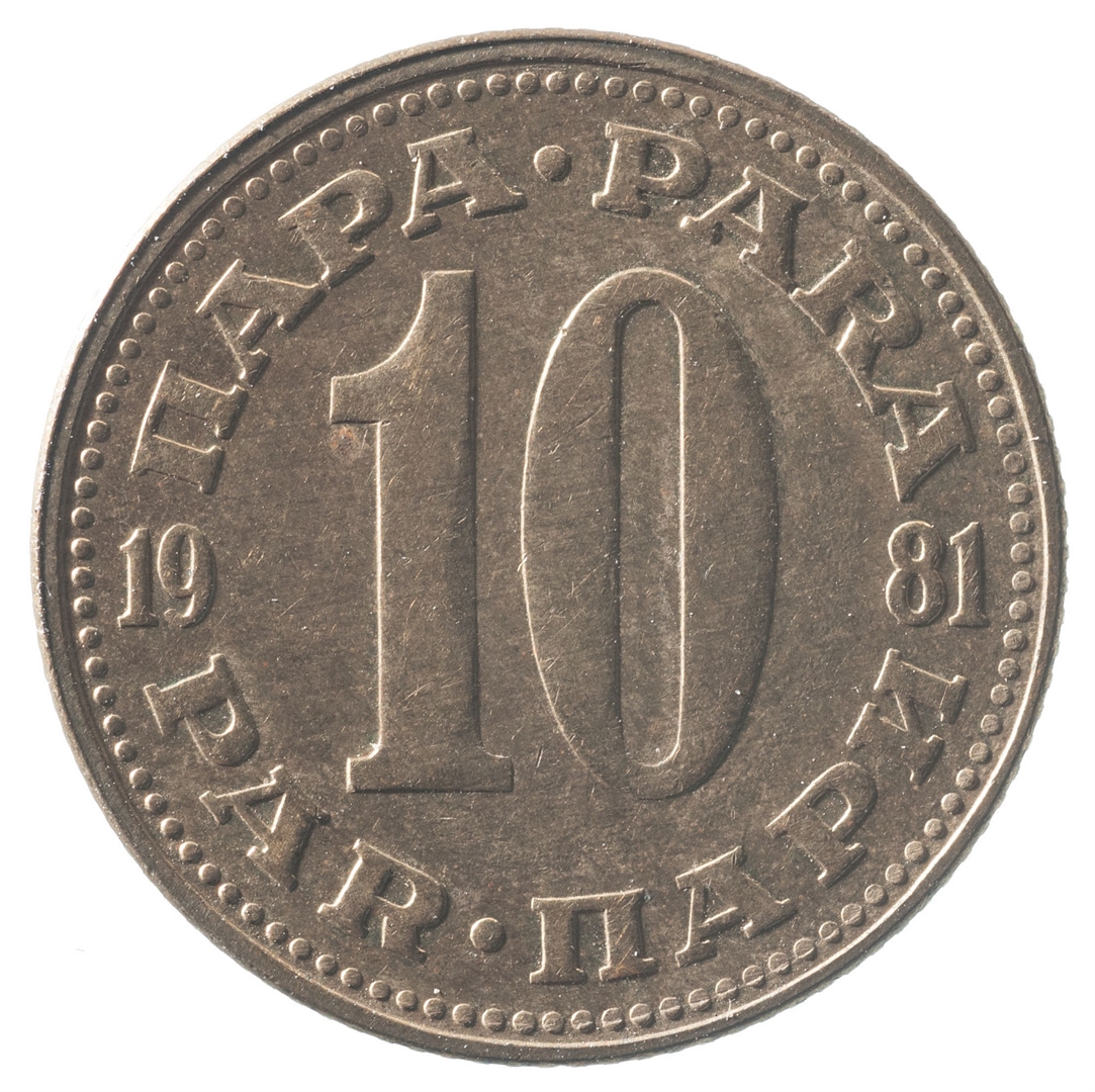 Avers: U sredini državni grb. U gornjem djelu uz rub polukružno napisan tekst SFR JUGOSLAVIJA na latinici i ćirilici. Revers: U sredini broj 10 (nominala), a oko njega tekst PARA na četiri jezika. U sredini uz lijevi i desni rub upisana godina 1981.