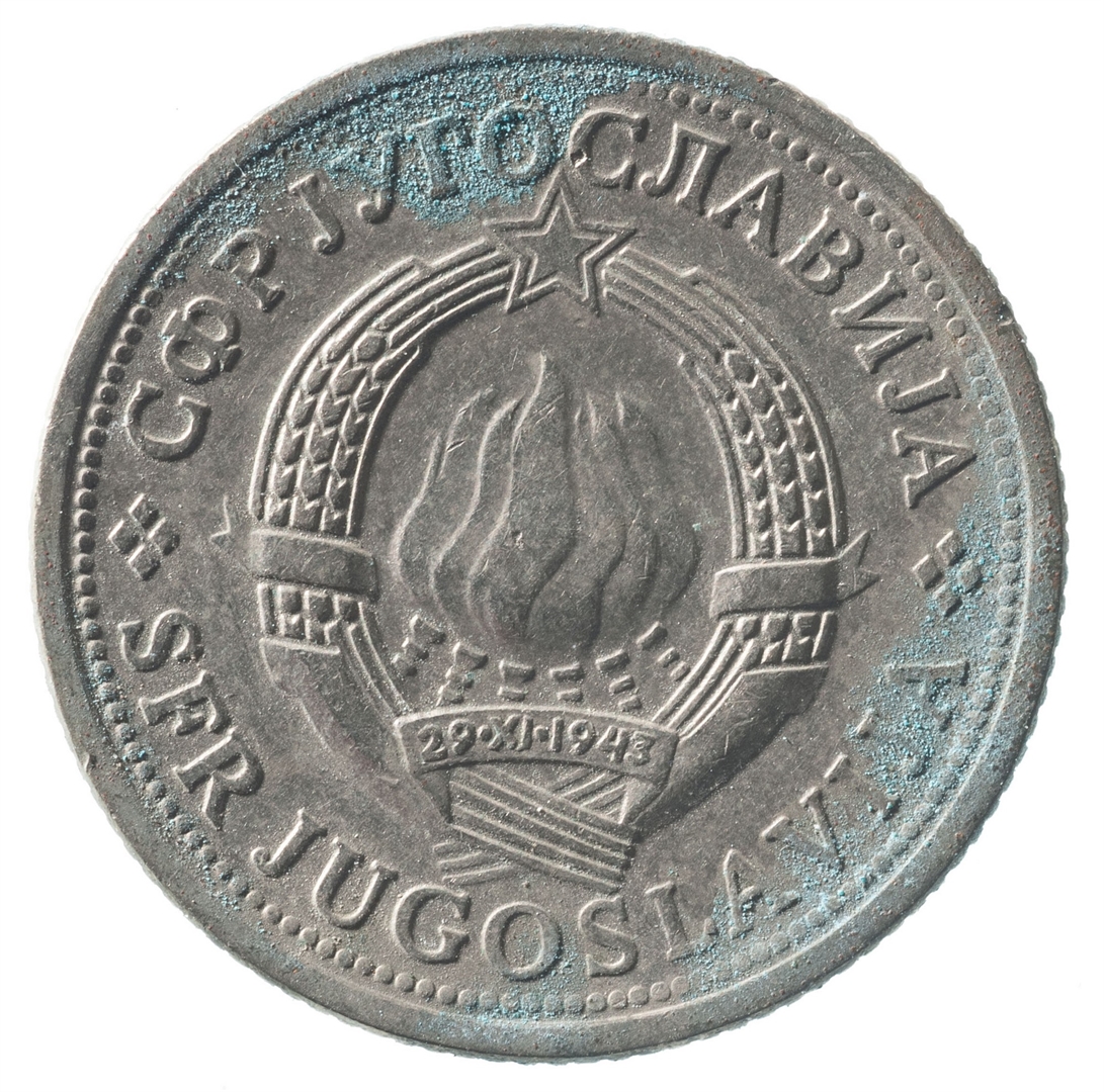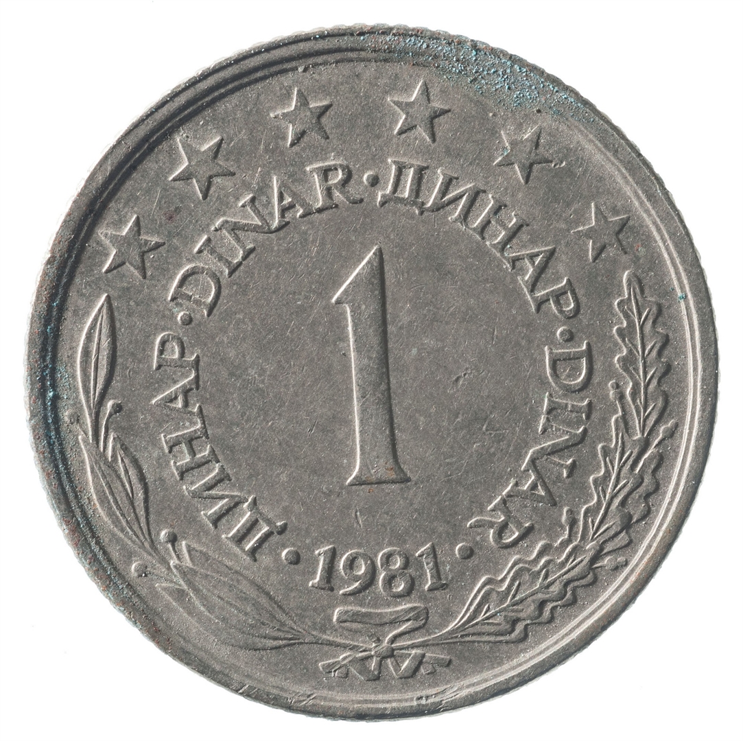U sredini broj 1 (nominala), oko njega tekst DINAR na četiri jezika, a ispod toga godina 1981. Duž gornjeg ruba polukružno poredano 6 petokrakih zvjezdi.